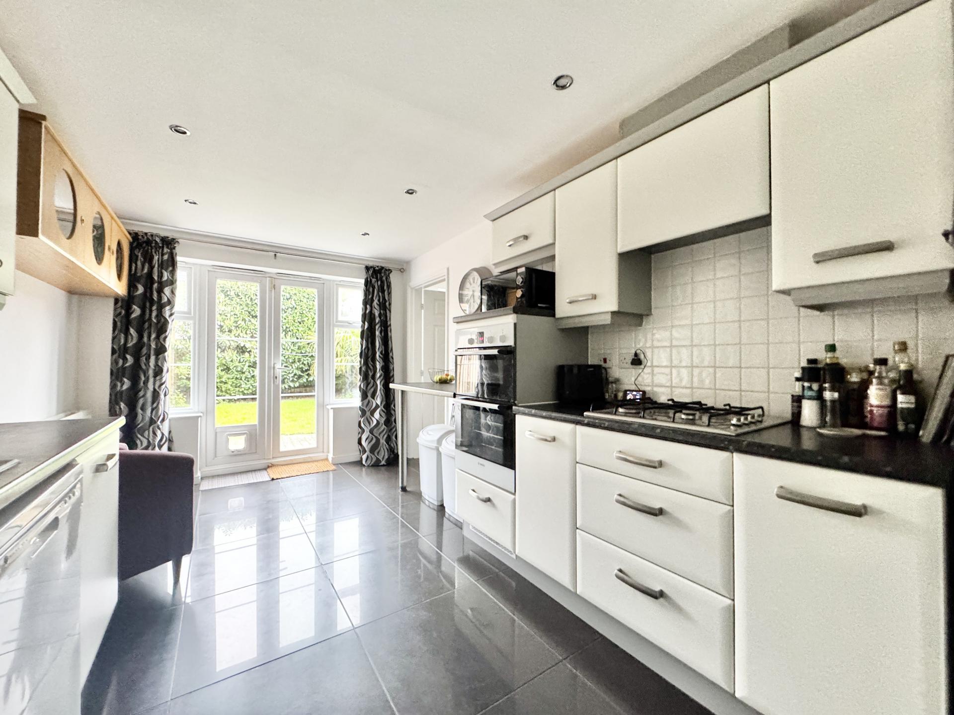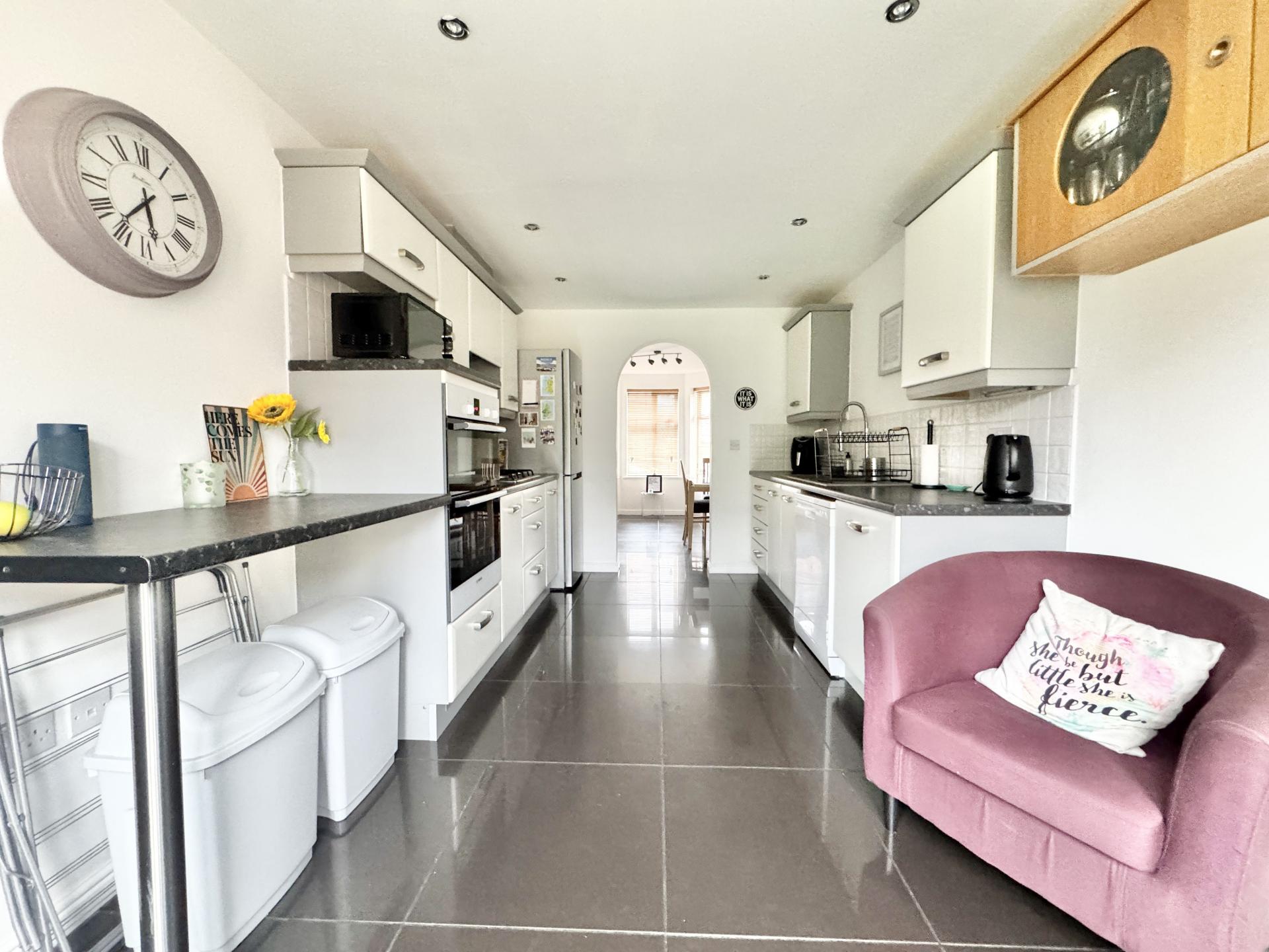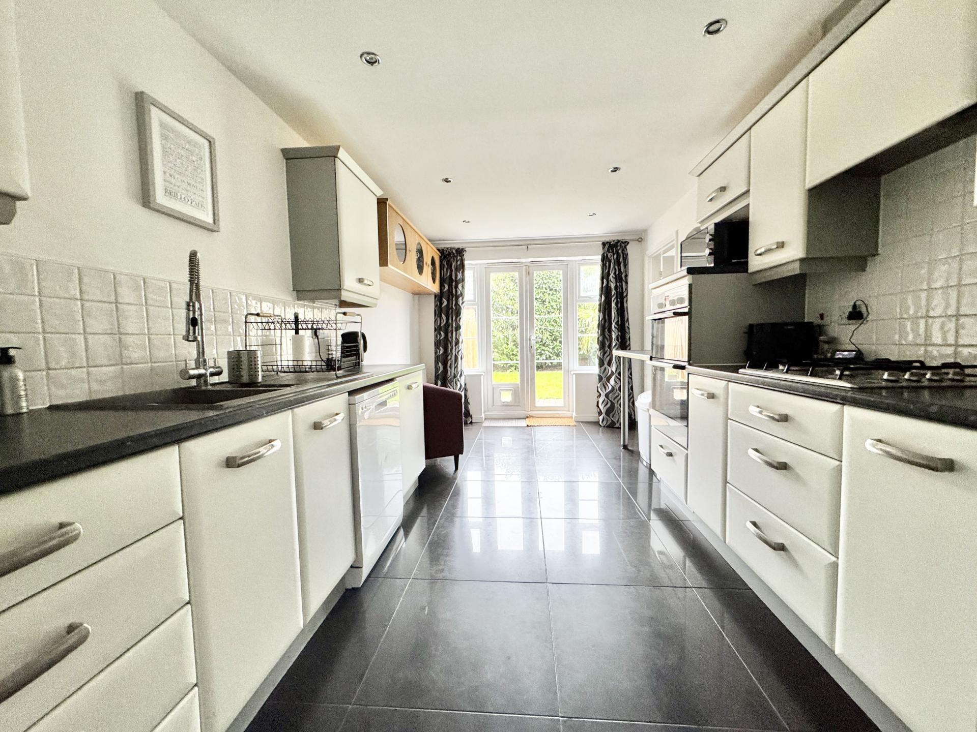 Fitted with a range of wall and base units, sink and drainer unit, gas hob with extractor fan over, electric oven.