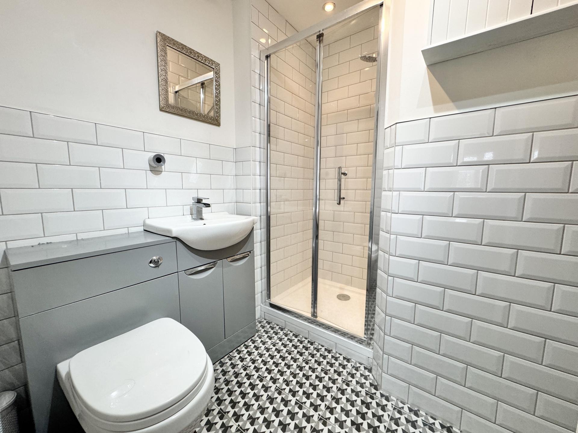 Shower cubicle with a low level WC, hand basin, radiator