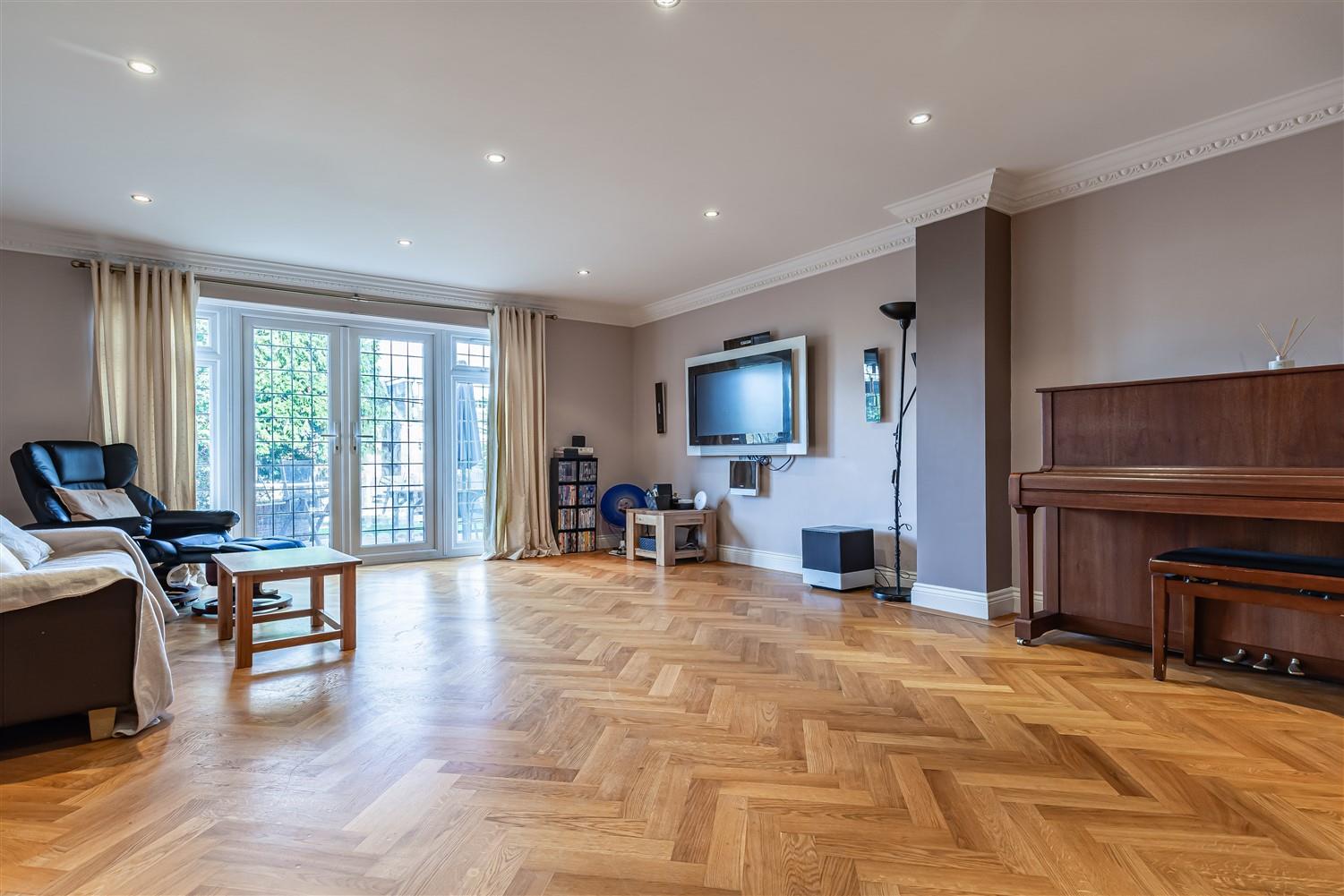 This exquisite family home is well proportioned and offers 2750 sq ft of accommodation comprising with an entrance vestibule with double doors leading to an impressive entrance hallway featuring Herringbone design block paved flooring. All rooms are accessed via timber double doors to include a study, formal dining room/playroom, 20' lounge with French doors to the rear garden, a wonderful family room includes a fitted kitchen opening onto a dining and tv area with French doors leading to the rear garden. There is a utility room and ground floor guest cloakroom. a door gives access to the integral garage which is currently used as a gym, along with an additional plant and storage room.