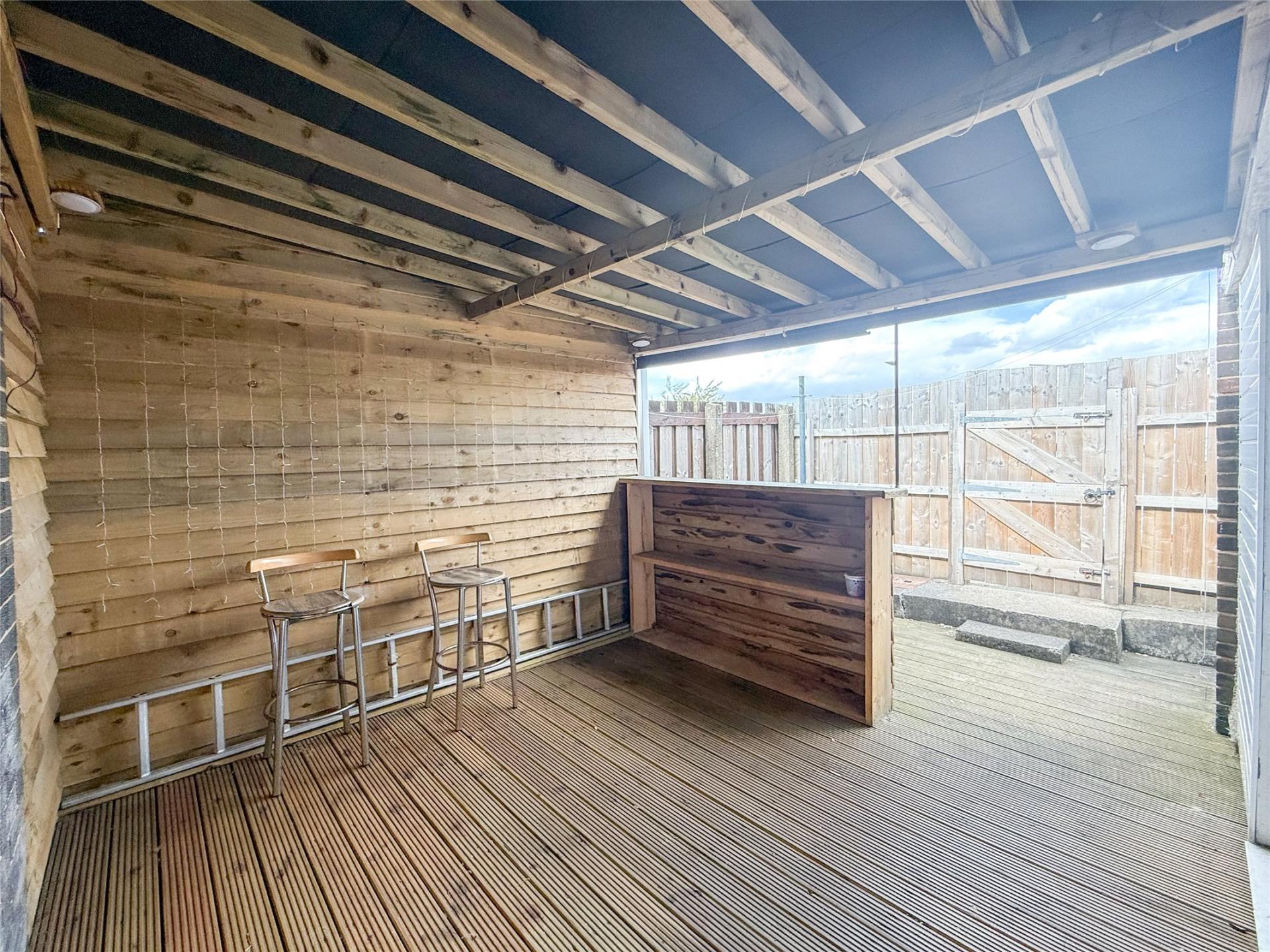 Externally, the property enjoys outdoor spaces to both the front and rear. The front garden is mainly laid to lawn with a decked seating area, offering a pleasant spot to sit and enjoy the surroundings. To the rear, the garden has been designed with low-maintenance living in mind, predominantly decked and partially covered with a roof, making it an excellent year-round entertaining area.