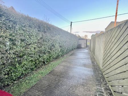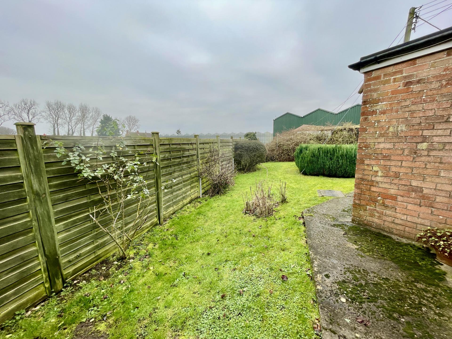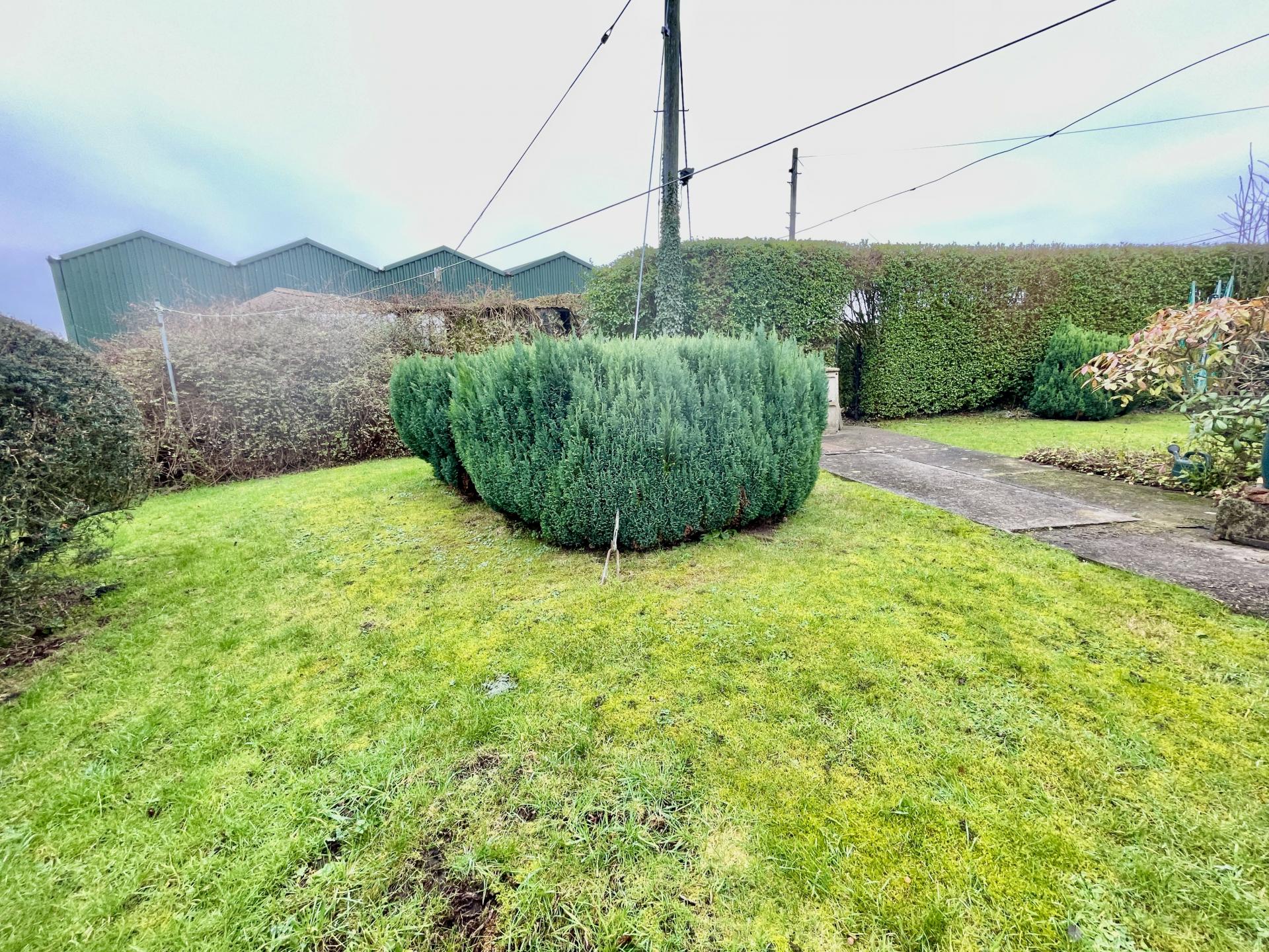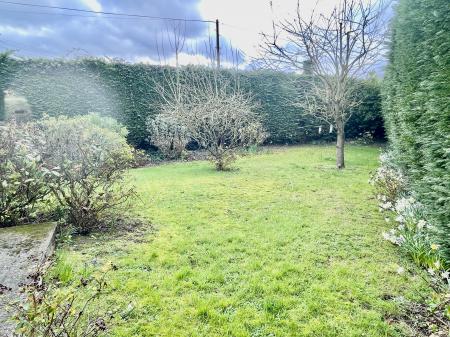 Wrought iron gate to the side leading to the wrap around garden which is mainly laid to lawn with a wide range of mature shrub and tree borders with various fruit trees, outdoor lighting, cold water tap. Wooden garden shed. Oil storage tank.