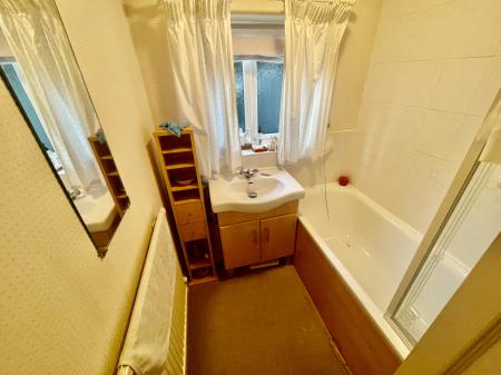 FAMILY BATHROOM 5' 4" x 5' 6" (1.64m x 1.70m) Obscured UPVC double glazed window to the side elevation, coved and textured ceiling, centre light point, part tiled walls, radiator, fitted with a two piece suite comprising wash hand basin fitted into vanity unit with storage below, panelled bath with shower screen, taps and fitted Triton power shower over.