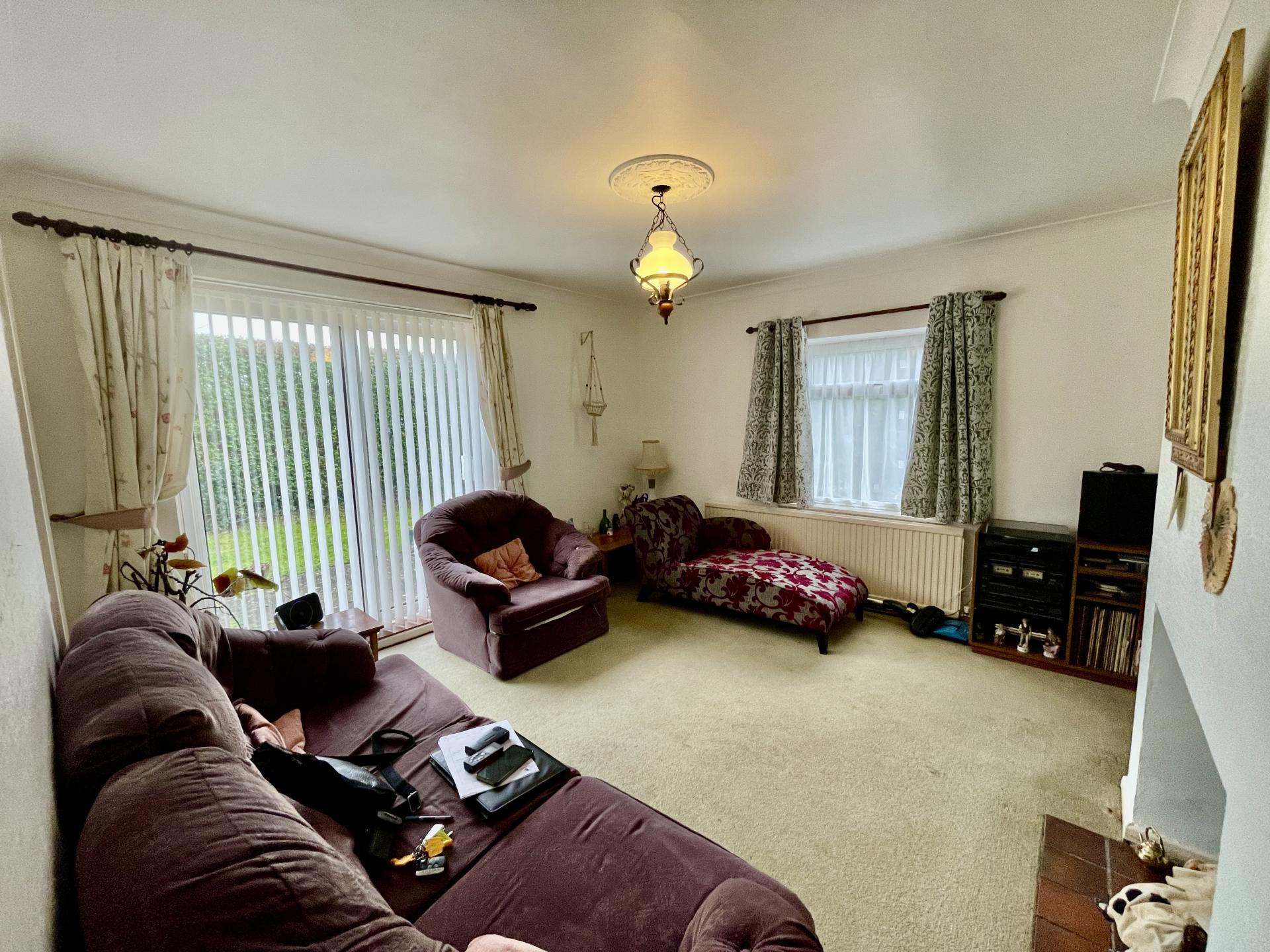 LOUNGE 13' 1" x 12' 5" (4.0m x 3.81m) UPVC double glazed sliding patio doors to the front elevation, UPVC double glazed window to the side elevation, skimmed and coved ceiling, centre light point, double radiator, BT point, TV point, tiled open grate (sealed but could be reinstated), storage cupboard off with shelving and lighting.