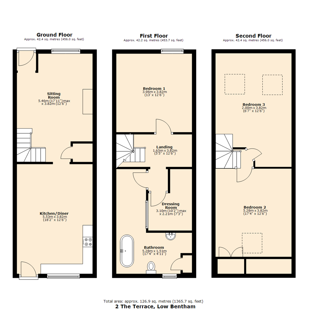 The first floor comprises a double bedroom and a dressing room, alongside a family bathroom, while the second floor features two generous double bedrooms.