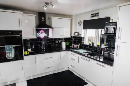Head through to my kitchen, where sleek black worktops meet high-gloss white units pure Pinterest perfection. There`s kickboard lighting, a multi-fuel stove (included in the sale but currently disconnected), and even room for a dining setup that`s ideal for friends or family. Patio doors open right into my sunroom, drenched in light perfect for morning coffee or lazy Sunday brunches.
