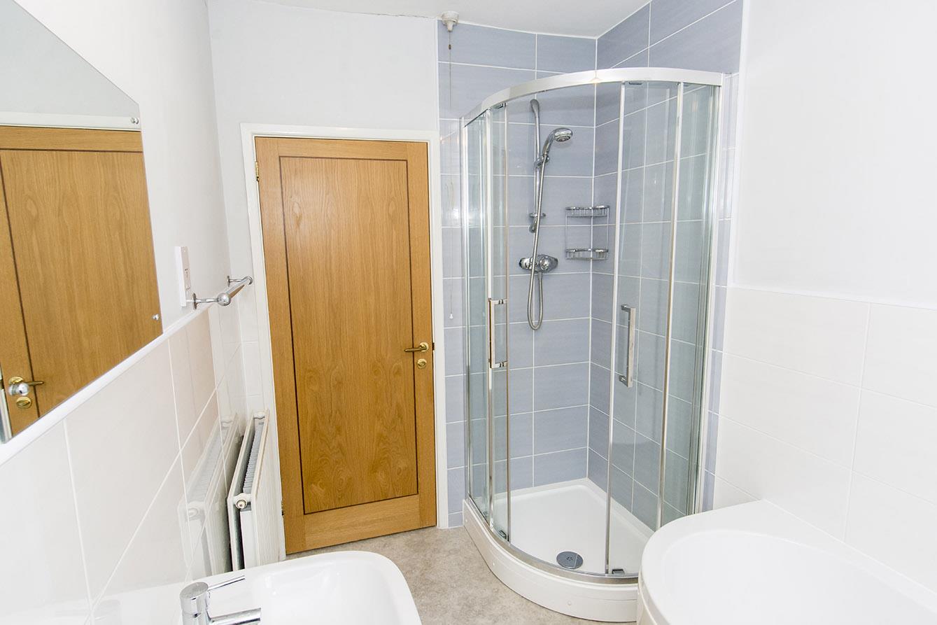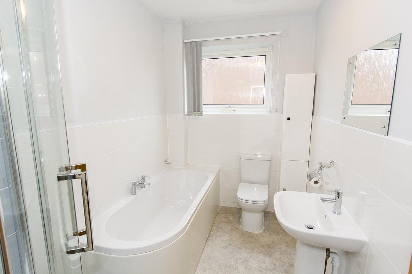 Bathroom - 1.80m x 3.00m (5'11" x 9'10") - Fitted with a low-level WC. Pedestal hand wash basin. Bath. Separate shower. Ceramic wall tiles and vinyl flooring throughout. Obscure window to the side aspect and a radiator.