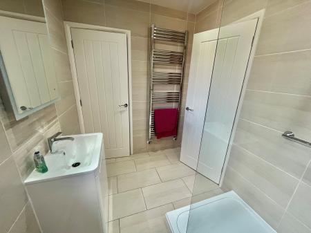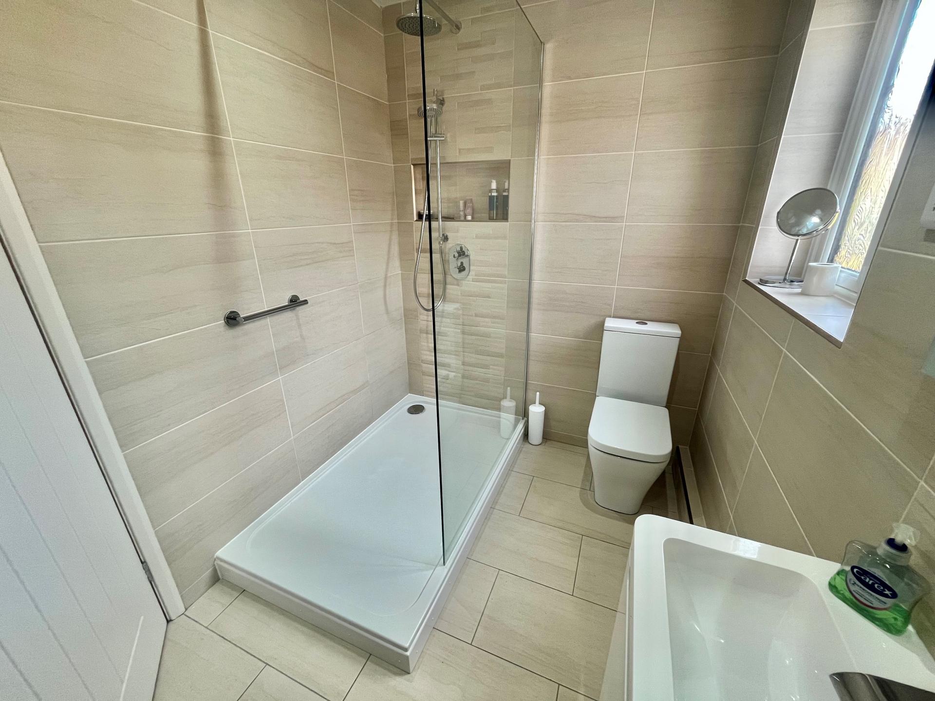MODERN SHOWER ROOM 8' 11" x 6' 0" (2.74m x 1.83m) 4 recessed ceiling lights, automatic extractor fan, fully tiled walls, tiled floor, 1500mm walk-in shower with over head sprinkler and recessed toiletries shelf, glazed screen, low level WC with push button flush, moulded hand basin with mono block mixer tap and vanity cupboards beneath, touch sensor mirror with built-in demister, internet connection, obscure glazed UPVC window to the side elevation, shaver point, vertical radiator/towel rail, useful fitted cupboard with shelving.