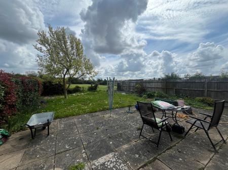SOUTH FACING REAR GARDENS Extensive paved patio, brick pathway, lawn, stocked borders, Magnolia tree and pleasant open views of grassland and trees to the rear.