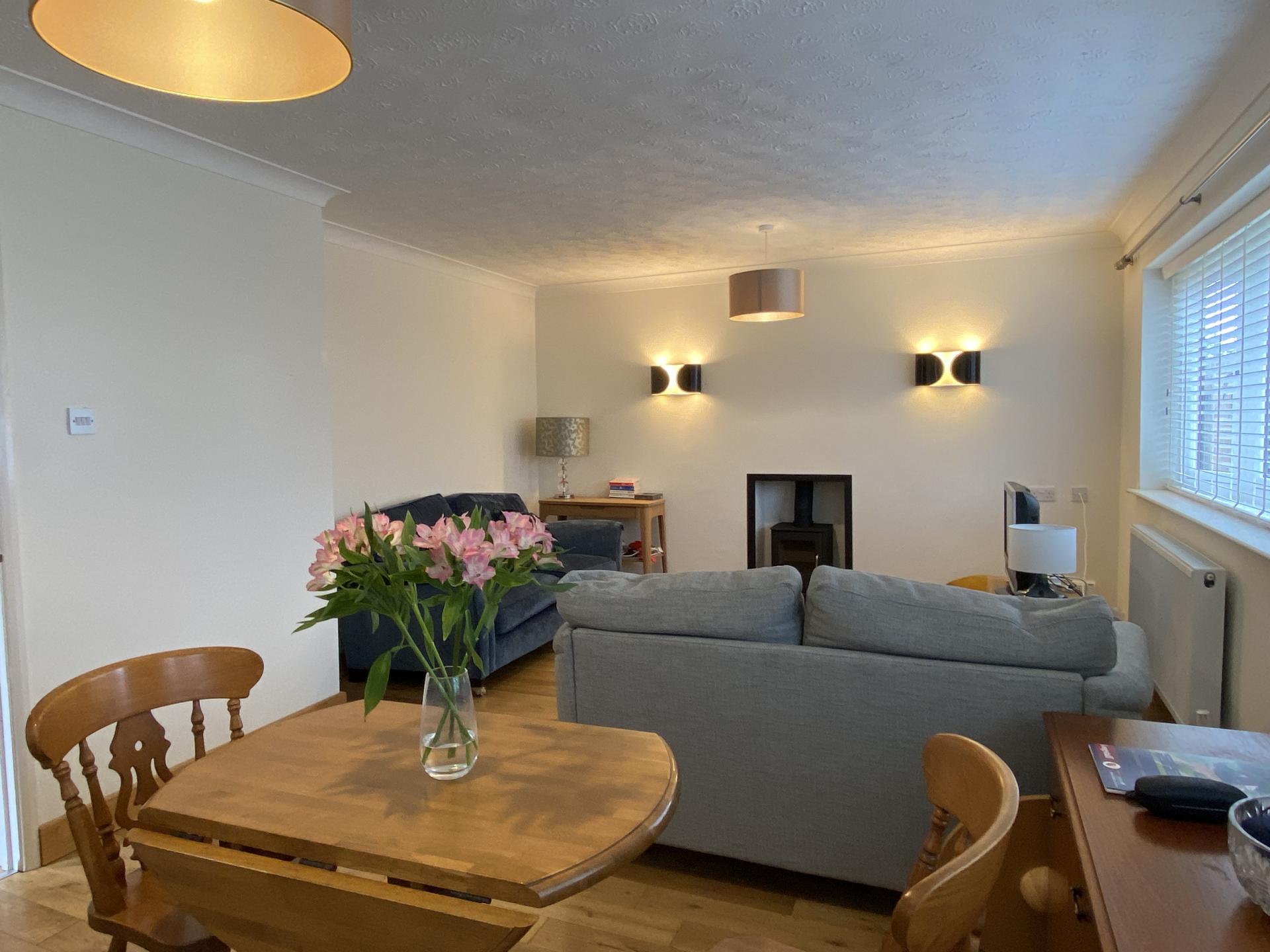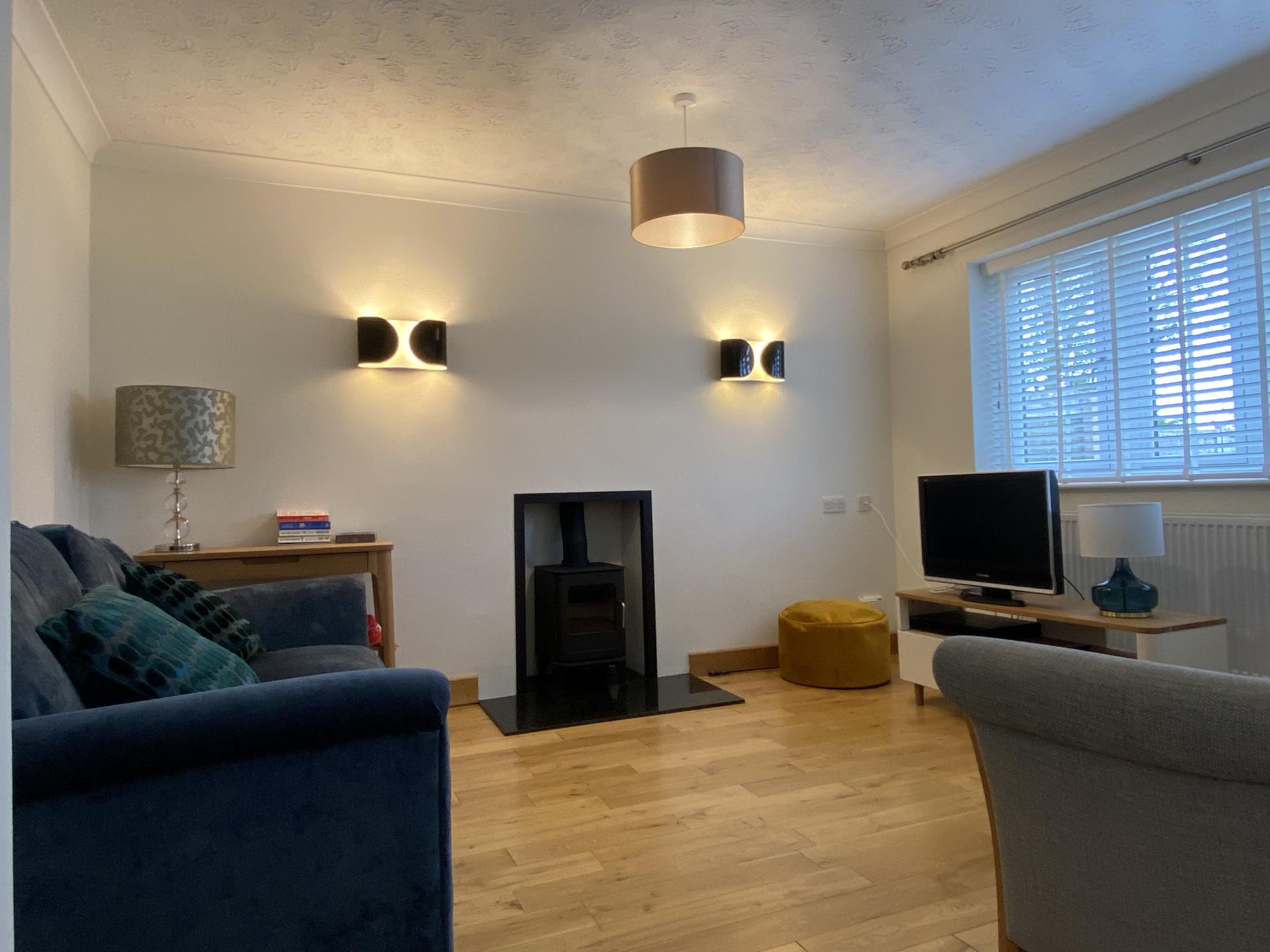 LOUNGE DINER 19' 5" x 12' 11" (5.92m x 3.96m) maximum Dual aspect with UPVC window to the side elevation and 2 UPVC windows to the front elevation all with fitted Hillarys blinds. 2 radiators, coved and textured ceiling, 2 ceiling lights, TV point, multi fuel log burner with polished granite hearth, wood block flooring, 2 wall lights, carbon monoxide alarm.