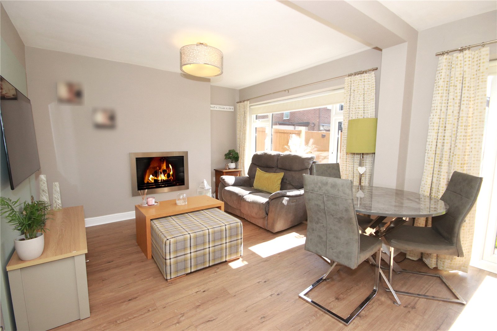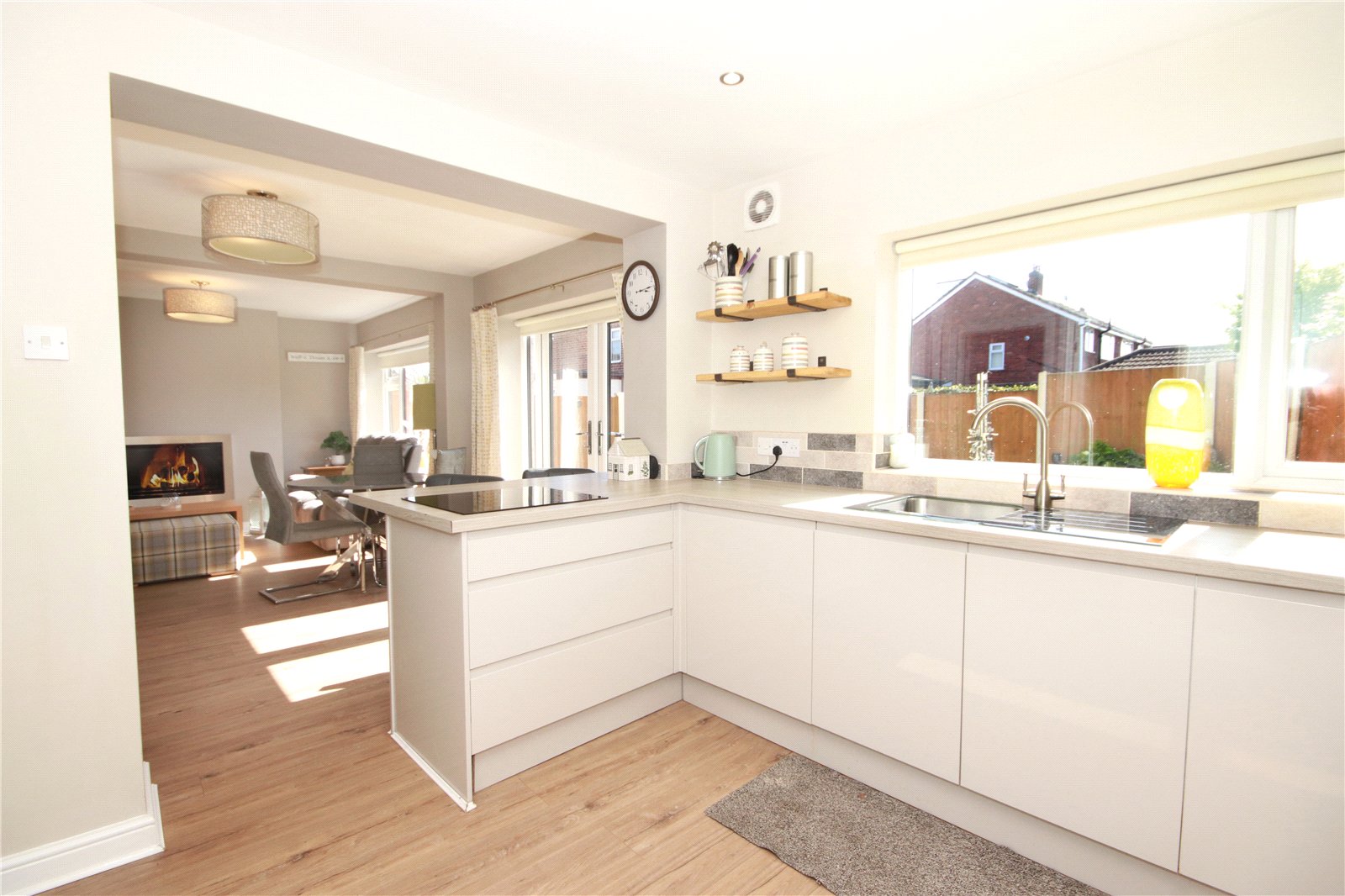 The property is entered via a welcoming entrance hall, providing access to a bright front living room and an impressive rear open-plan kitchen and living space. The contemporary kitchen is fitted with a range of modern units and integral appliances, creating a stylish and practical hub of the home. From the kitchen, there are convenient doorways leading to a utility room and a downstairs WC, with further internal access from the utility room into the garage.