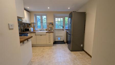 Kitchen - 3.48m x 2.95m (11'05 x 9'08) - A range of base, drawer and wall mounted units, solid wooden worktops, Belfast style sink unit, space for cooker, space for fridge/freezer, space and plumbing for dishwasher, part tiled walls, electric radiator, space for table and chairs, rear aspect double glazed upvc window, wooden stable door to the decked area.