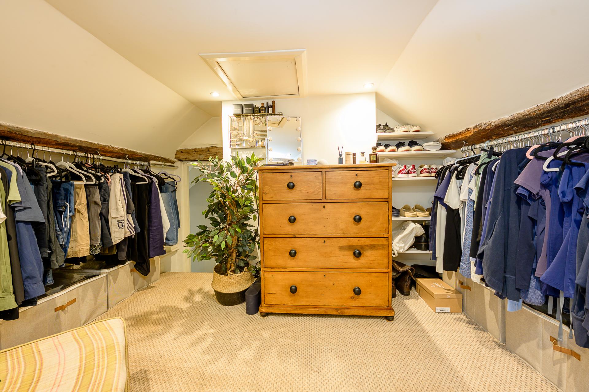 All six bedrooms are large enough to accommodate double beds. Of these, the master includes a partially vaulted beamed ceiling with skylights. It also benefits from having access to a dressing room, which carries hanging rails across two sides of the room.
