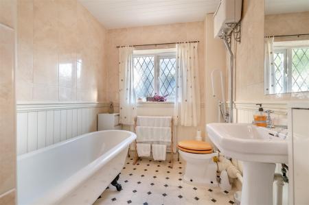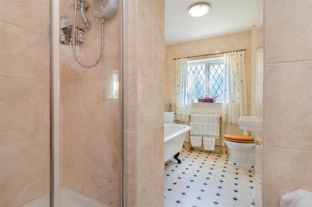 Bathroom - 1.98m x 3.96m (6'06 x 13'00) - Walk in shower with electric triton shower over, rolled top bath with taps over, W.C, sink with tap over, radiator, front aspect double glazed UPVC frosted window and several vanity units along with a shaving point and extractor fan.