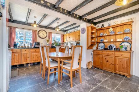 Kitchen/Diner - 4.09m x 5.51m (13'05 x 18'01) - Two front and one side aspect double glazed UPVC windows, range of wall, drawer and base mounted units, stainless steel drainer unit with tap over, space for under counter fridge/ freezer, space for dish washer, exposed celling beams, radiator, rayburn oven. Door giving access into: