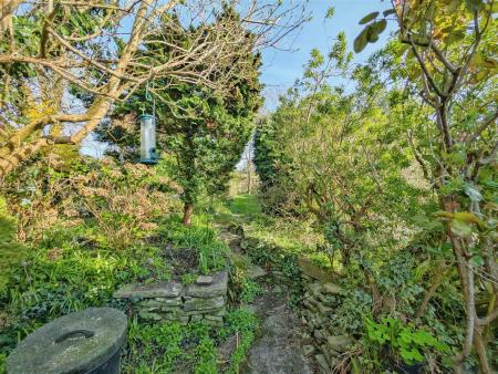 Steps lead up to the main garden which is laid to lawn with mature flower borders, shrubs and trees. Small pond. Enclosed by stone walling and fencing. Backing onto open fields.