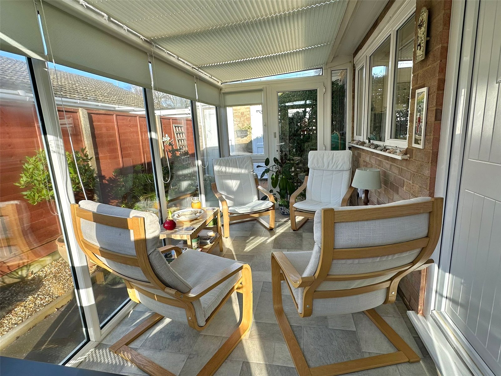 The front has a tarmacadam driveway providing off road parking leading to the garage approach with the remainder of the front laid to a further shingled driveway, lawn, and shrub bed borders, side access gate, and a further pedestrian gate set between the garage and the bungalow leads to the front entrance. A paved footpath leads to the Conservatory and the south facing rear garden, delightfully landscaped with areas of paved Sun Terrace, a central area of lawn, a feature Pergola, shrub and flower bed borders, two Timber Garden Stores, panel fenced boundaries and rear pedestrian gate