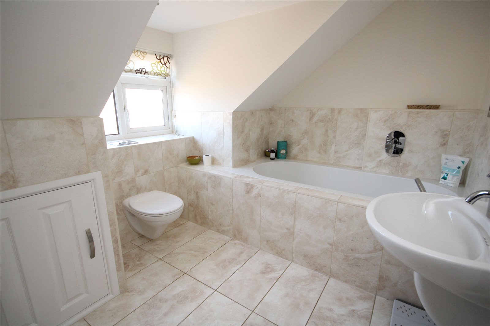 Being part tiled comprising wash hand basin with mixer tap, low level w.c., bath with mixer tap and hand held attachment, tiled flooring, chrome ladder towel rail, underfloor heating.