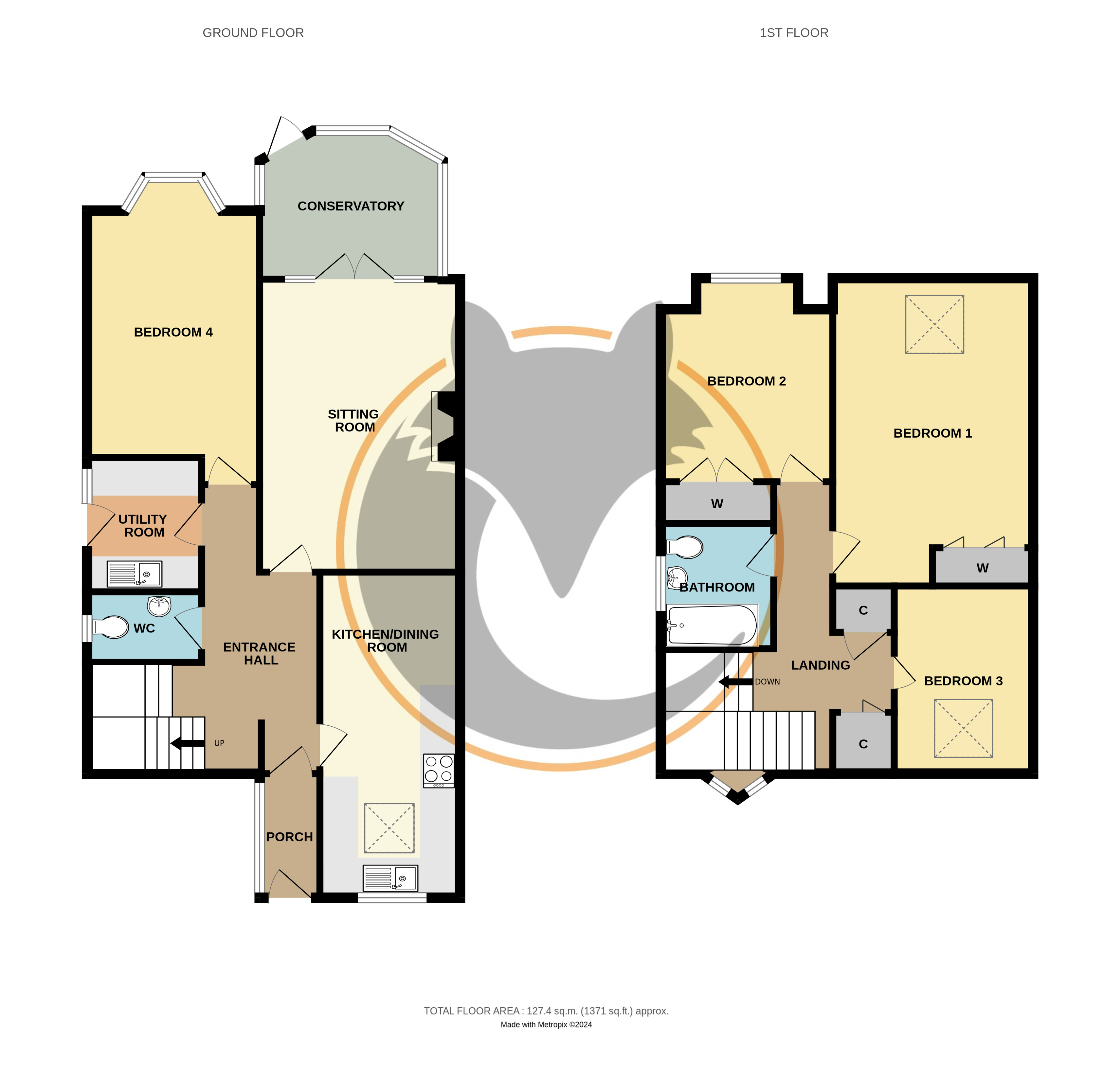 Precis of accommodation: entrance porch, entrance hall, cloakroom, kitchen/diner, sitting room, conservatory, bedroom four, utility room, first floor landing, three bedrooms and bathroom. Outside: garage.