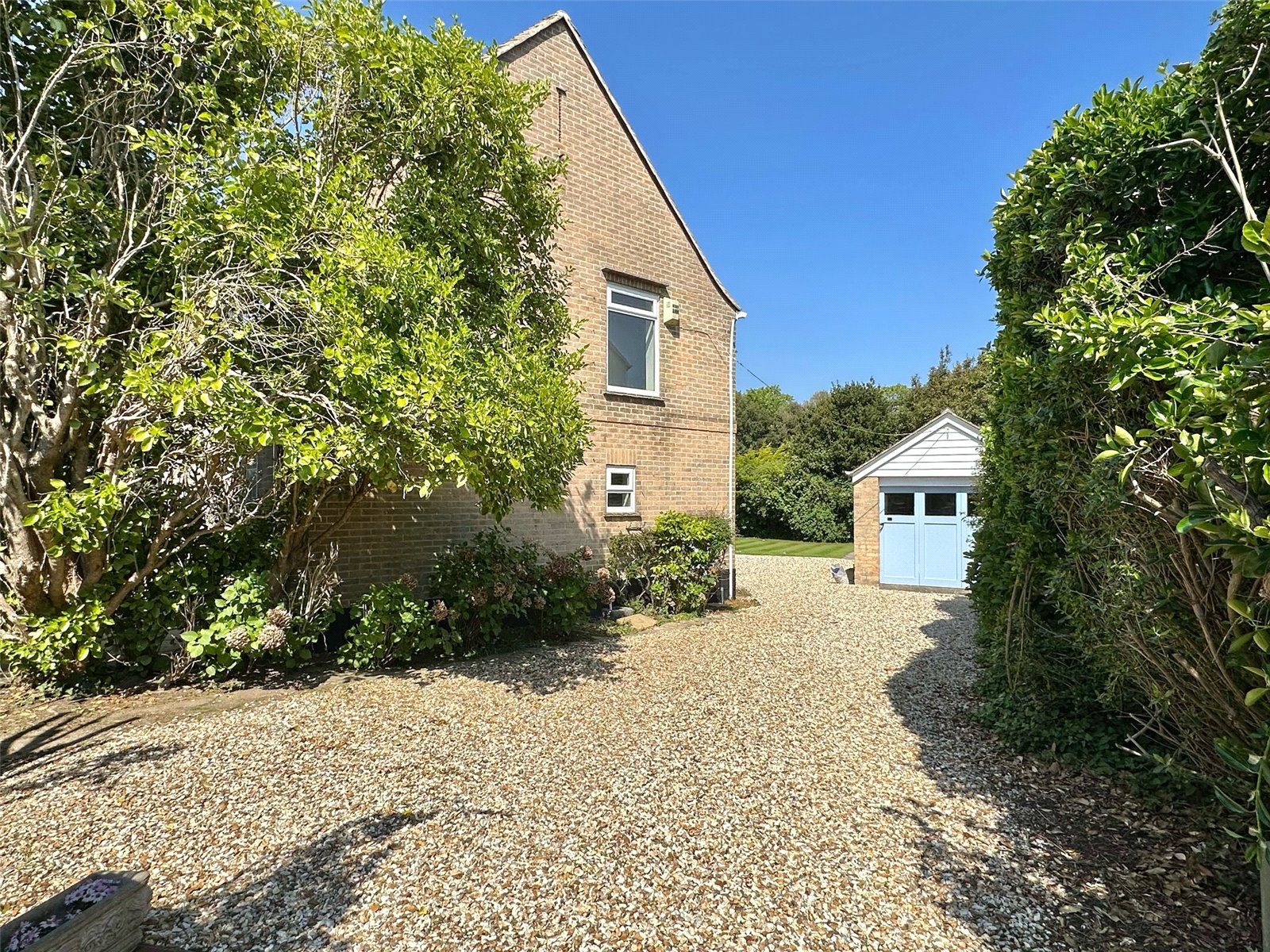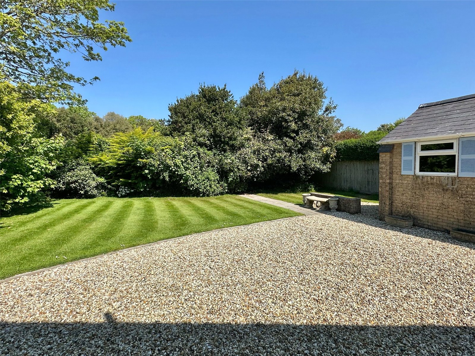 A shingled driveway approach leads to the front entrance, and garage. A sunny aspect garden predominantly laid to lawn with mature shrub and specimen tree borders. There is an area of paved terrace, fenced and walled boundaries, outside cold water tap