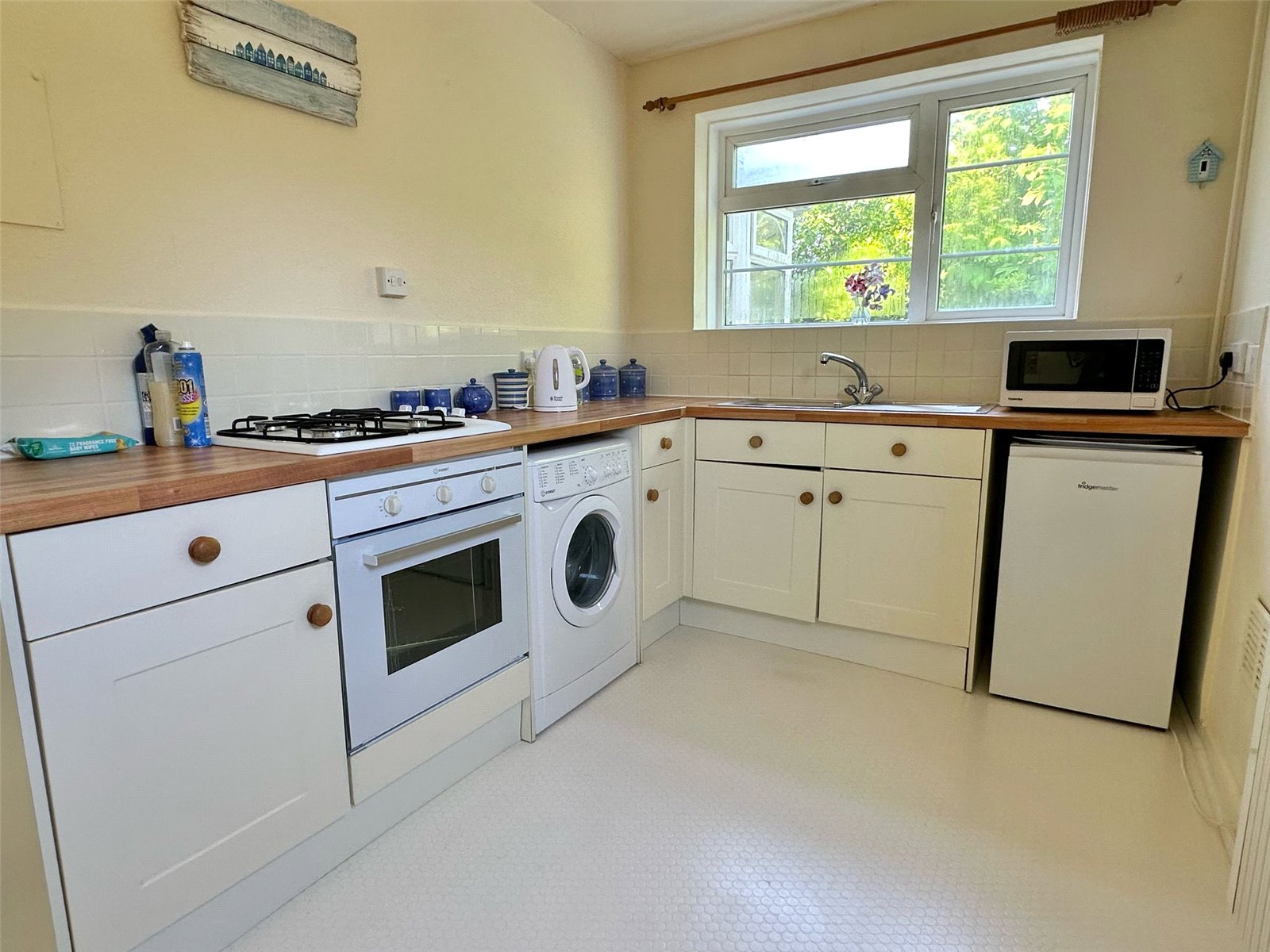 Comprising single bowl single drainer mixer tap sink unit set in to a work surface with base cupboard and drawer units, integrated oven, gas hob, space and plumbing for washing machine, space for undercounter fridge, larder cupboard, door leading to the rear garden, radiator, ceiling light point, UPVC double glazed window
