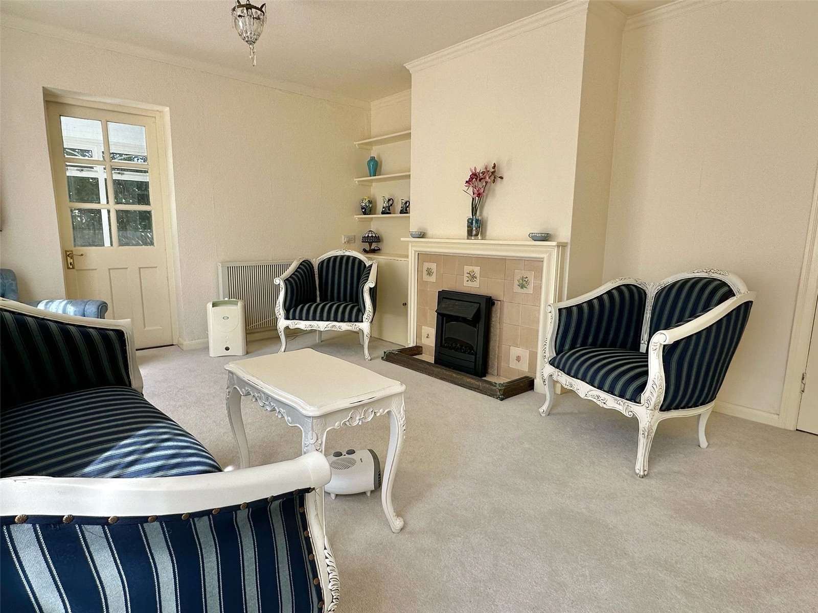 Central feature fireplace with adjacent base storage cupboard and recessed shelving, full height UPVC double glazed windows, ceiling light points, radiator, and door leading to: