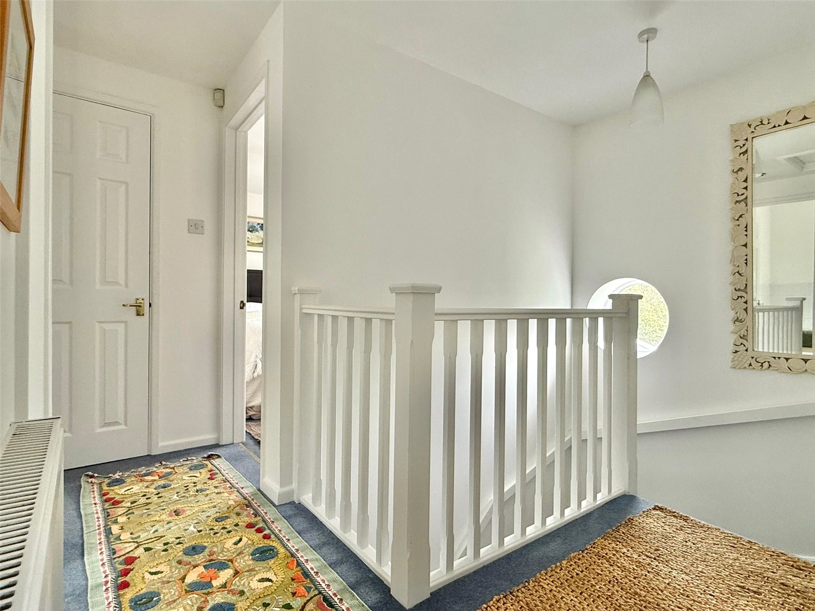 Stairwell from the Entrance Hall leading to the First Floor Landing with a port hole window, central heating radiator, ceiling light points, trap giving access to the roof space, linen cupboard, and doors leading to: