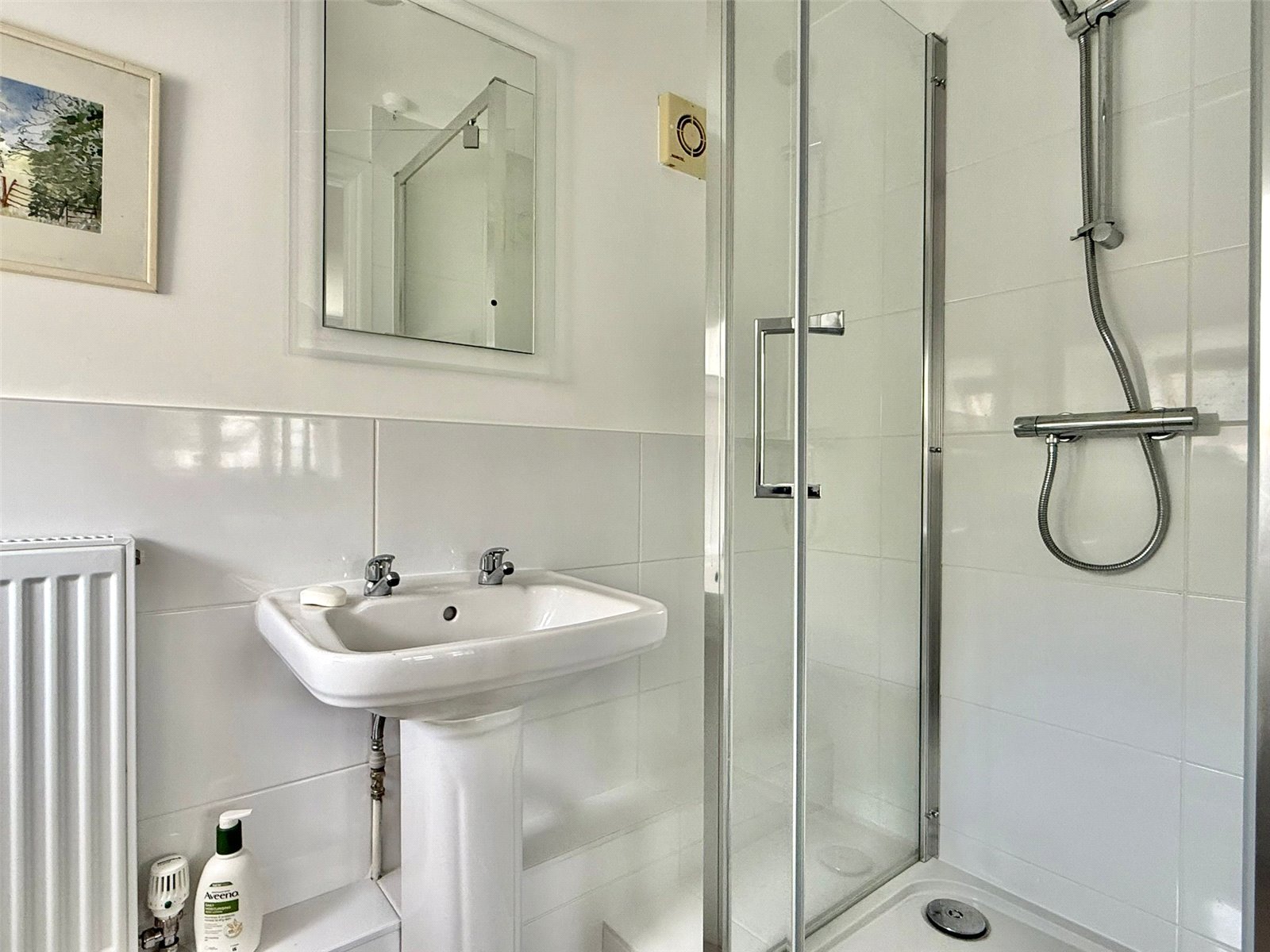 Comprising shower, wc, wash hand basin with mirror light over, central heating radiator, part tiled walls, ceiling light point, extractor