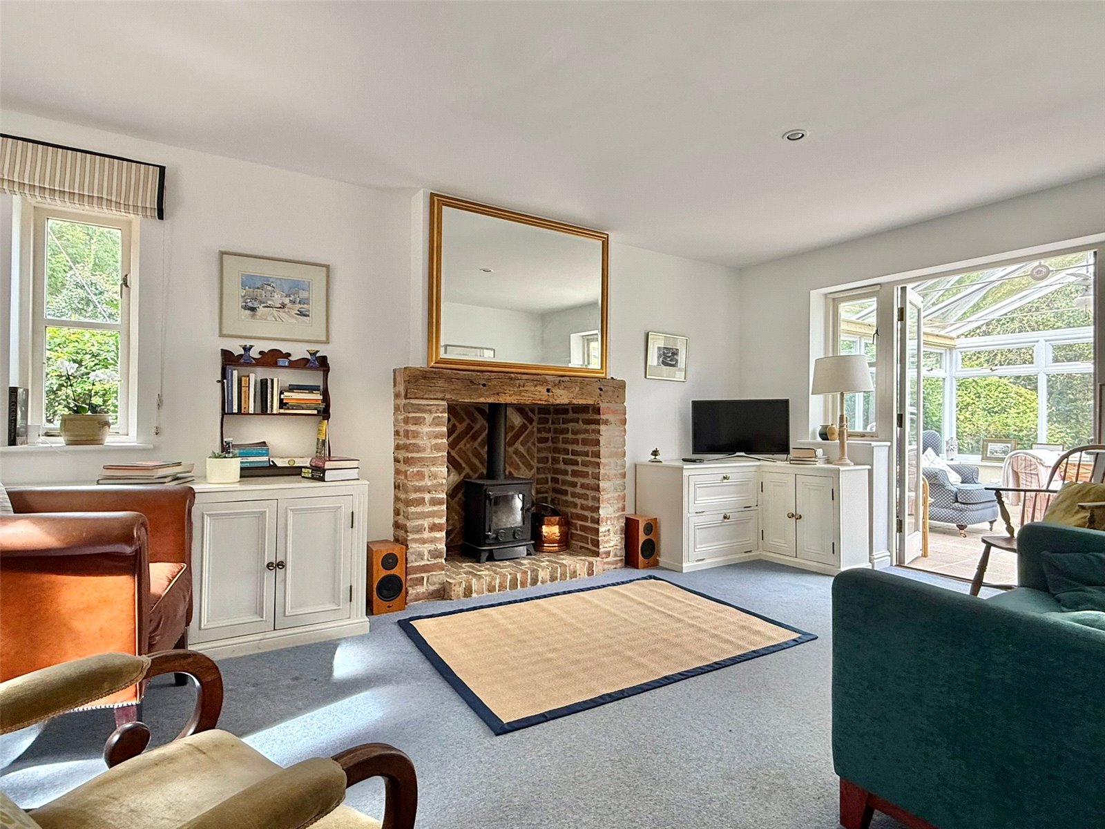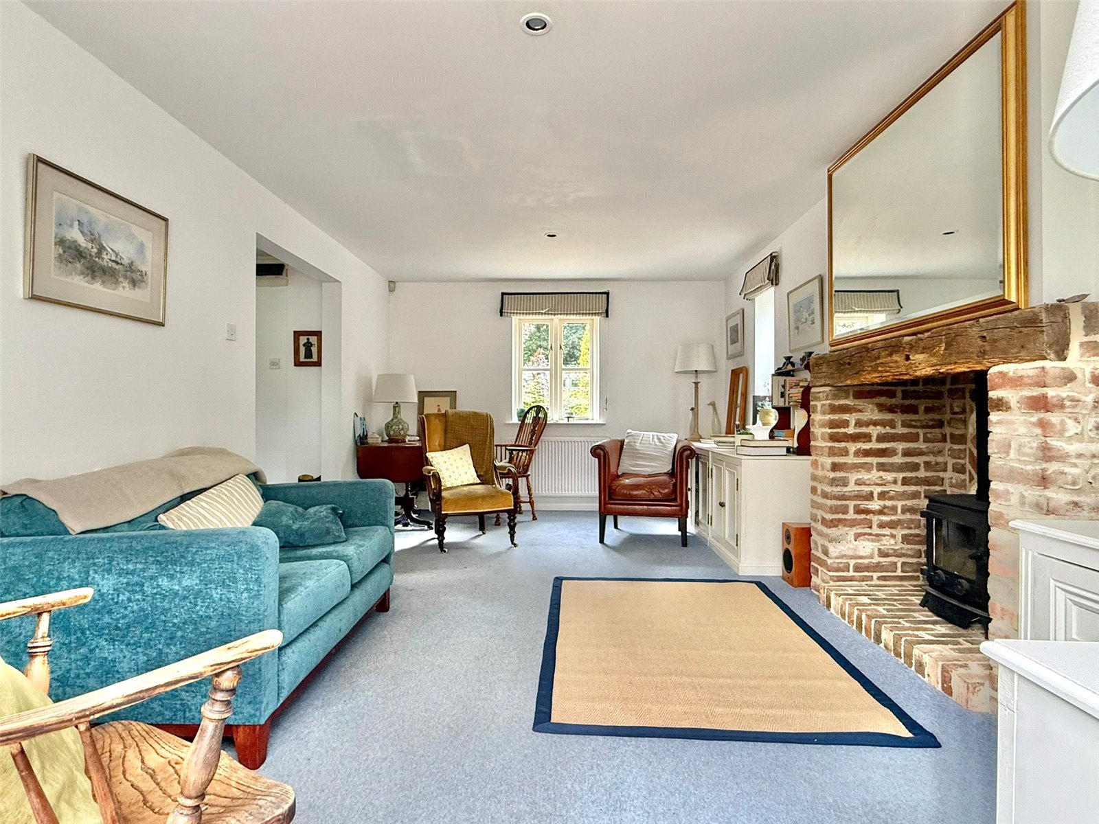 Central fireplace with timber mantle, brick surround and hearth with an inset coal effect gas fire, central heating radiators, recess ceiling spotlighting, tv point, understairs cupboard also housing the gas fired central heating boiler, triple aspect sealed unit double glazed windows double opening doors leading to: