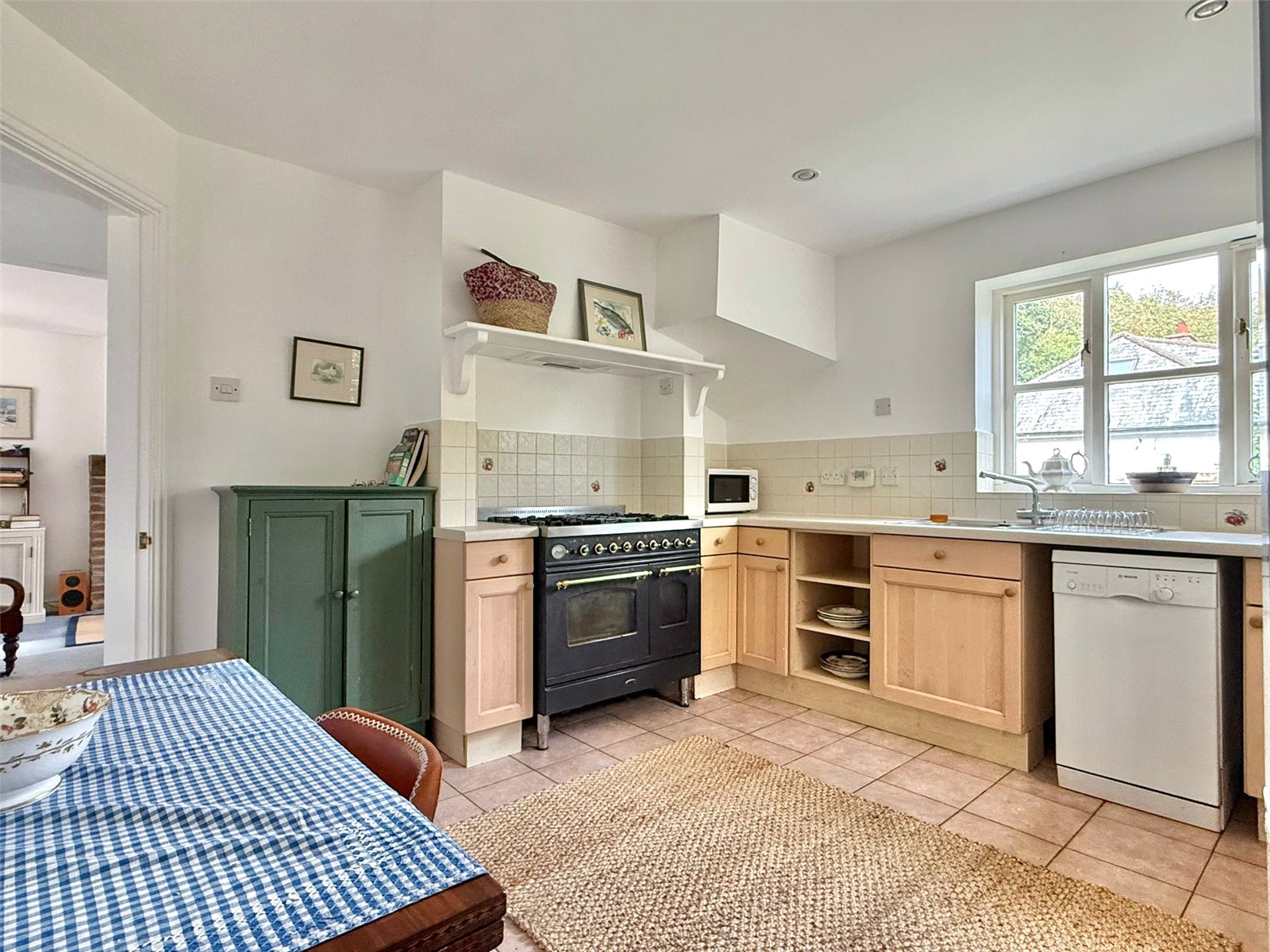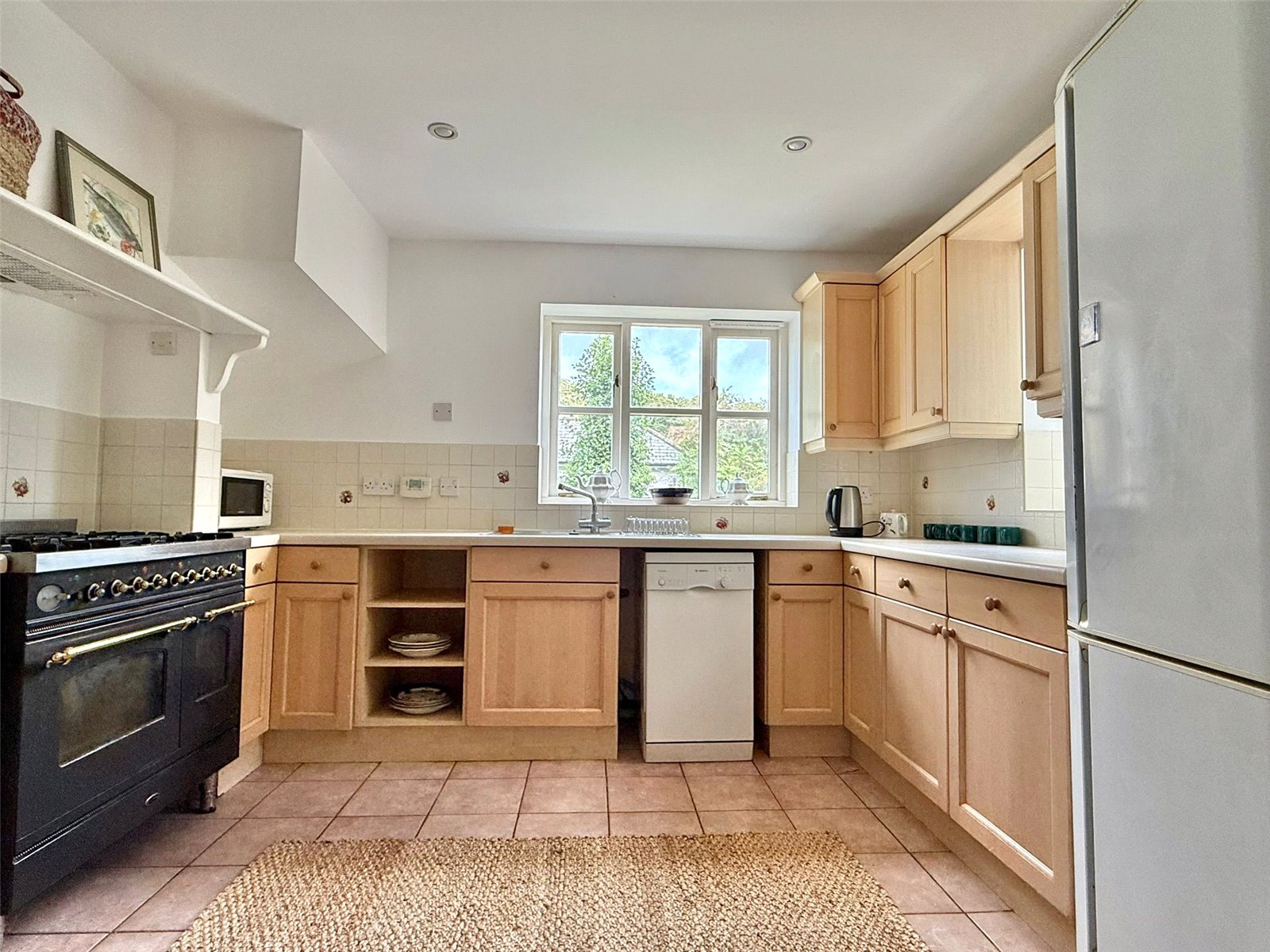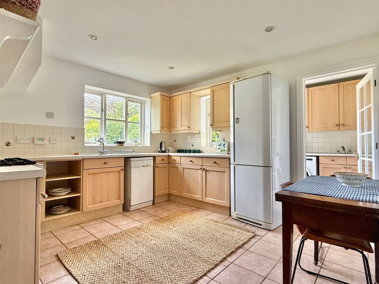 Comprising one and a half bowl single drainer mixer tap sink unit set in a worksurface with base cupboard and drawer units and matching eye level cupboard units, space for range style cooker with extractor over, space and plumbing for dishwasher, space for tall fridge freezer, space for breakfast table and chairs, double aspect sealed unit double glazed windows, recess ceiling spotlighting, central heating radiator
