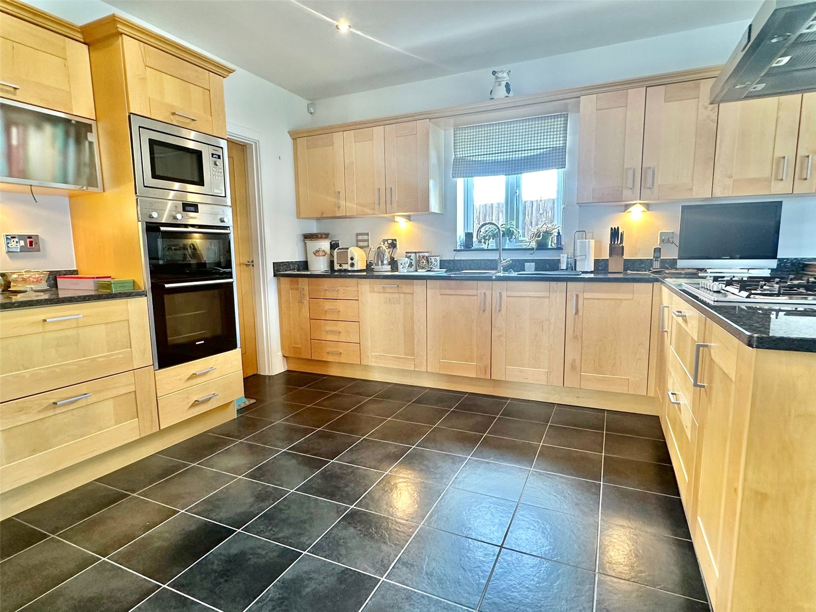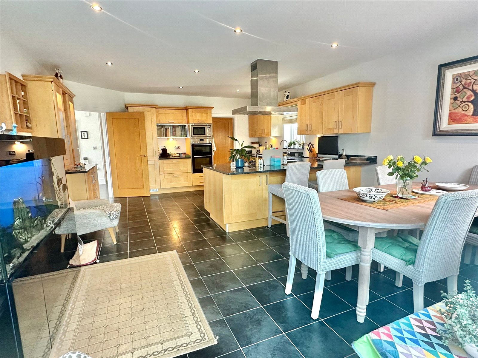 A superbly appointed kitchen with a comprehensive range of base cupboard and drawer units and matching eye level cupboard units, one and a half bowl mixer tap sink unit set in a granite work surface with water softener and filtered water tap, integrated Siemens double oven and microwave, dishwasher, integrated fridge/freezer, work surface lighting, five ring gas gob with overhead extractor, breakfast bar, ceramic tiled flooring, central heating radiators, recessed ceiling spotlighting, space for good sized dining table and chairs, UPVC double glazed windows, UPVC double glazed double opening doors with adjacent side screen leading in to:
