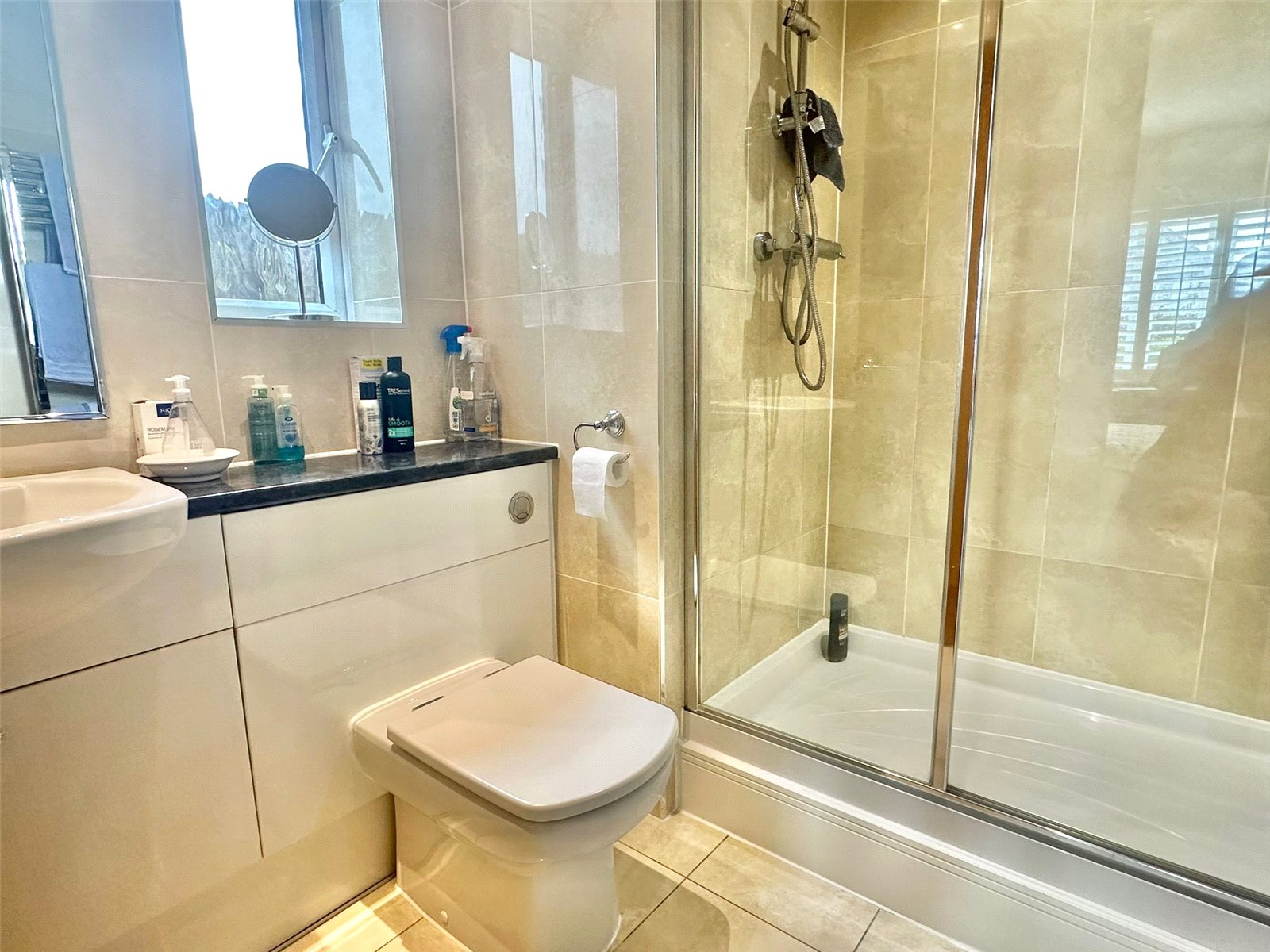 Comprising shower, concealed cistern wc, vanity wash hand basin, shaver point, tiled flooring and walls, recessed ceiling spotlighting, extractor, obscure UPVC double glazed window, heated towel rail