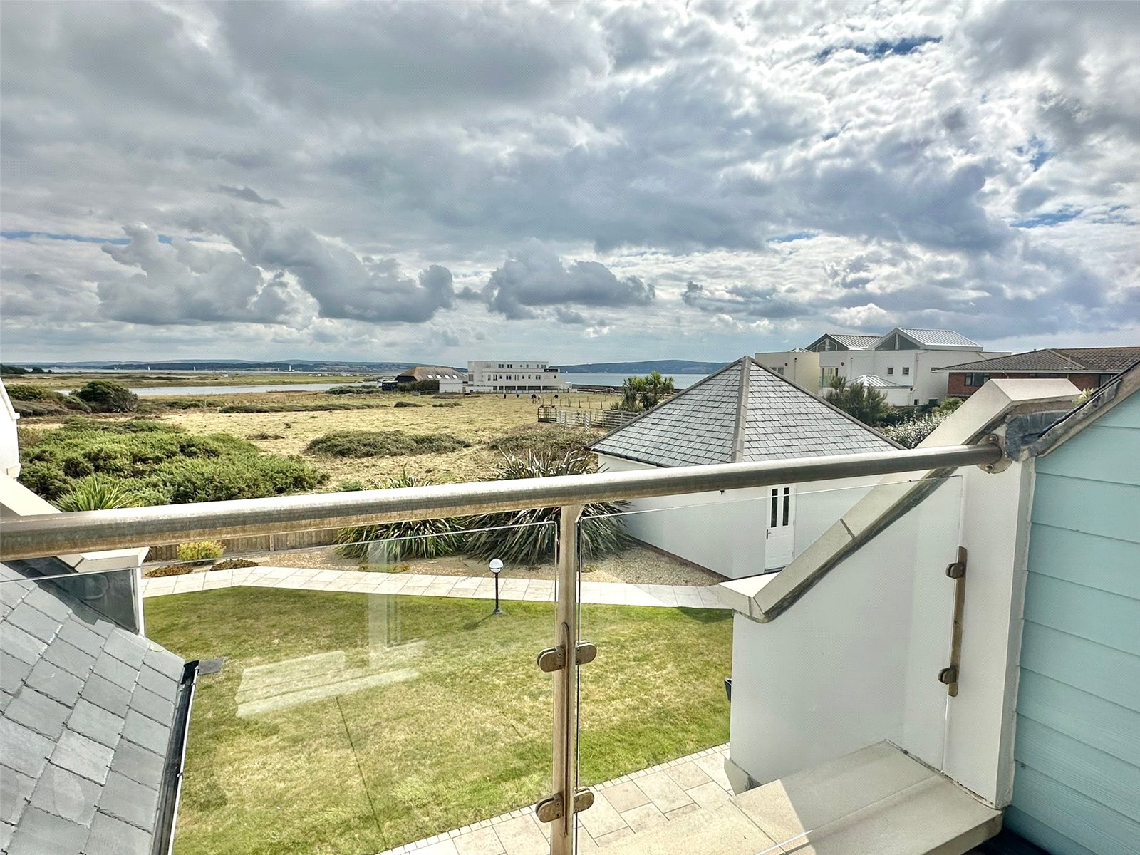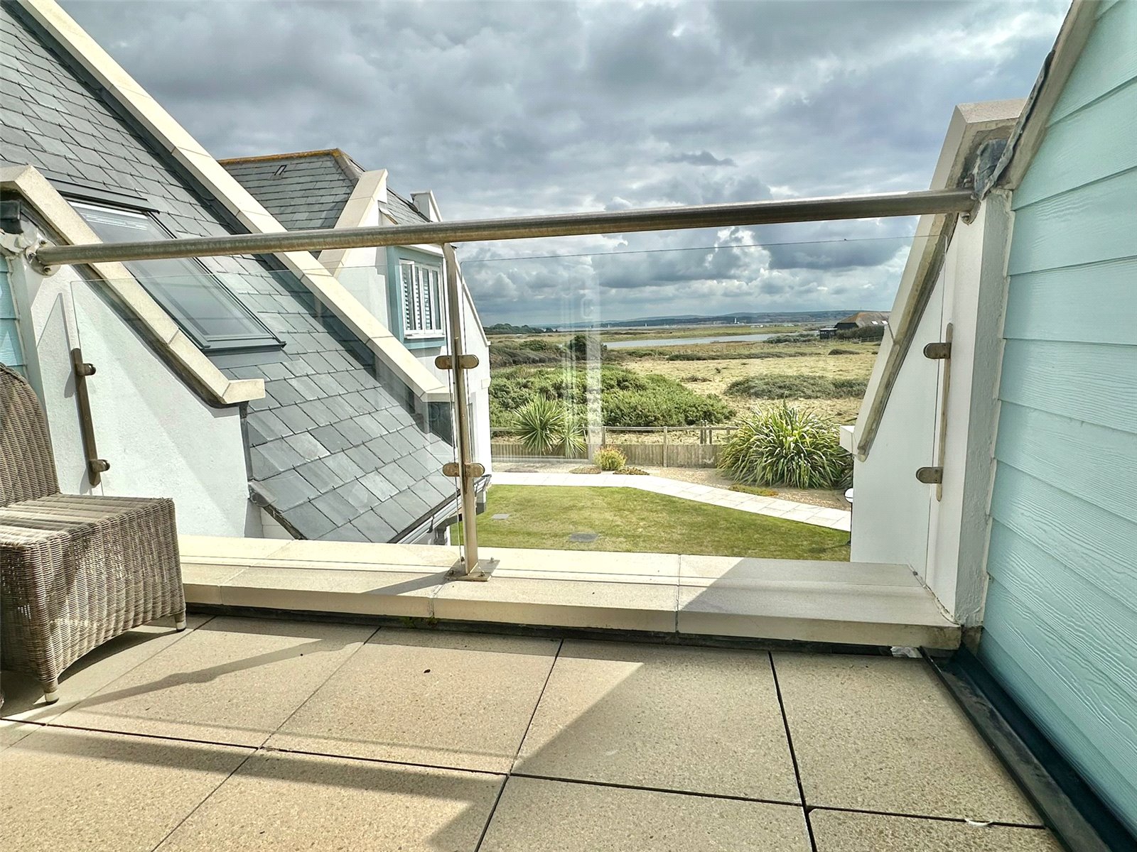 with breathtaking views toward Sturt Pond, Keyhaven River, Hurst Castle and Solent and Isle of Wight beyond, paved flooring, chrome balustrade with glass inserts, outside lighting