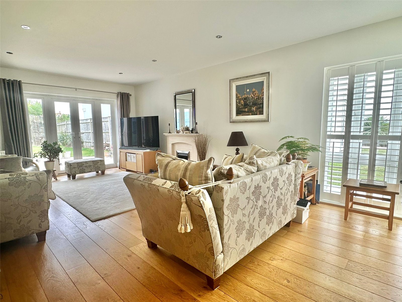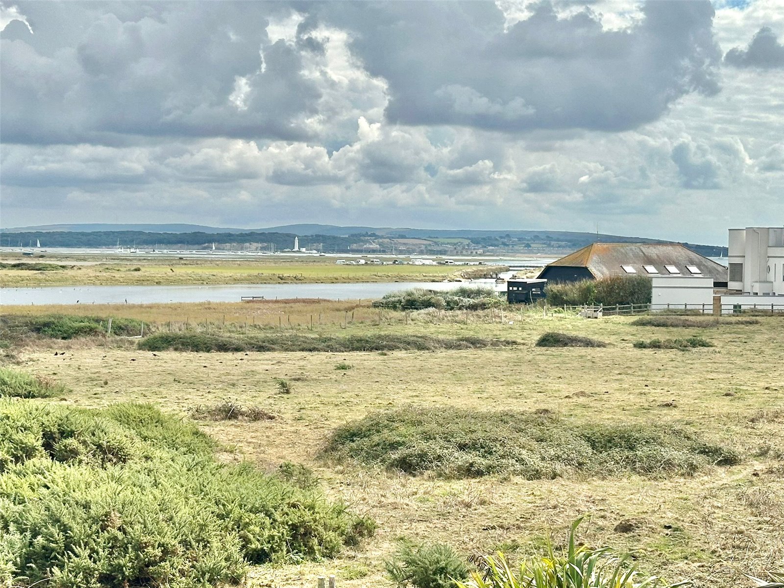 with oak engineered flooring, central polished stone fireplace with coal effect living flame gas fire, recessed ceiling spotlighting, central heating radiators, TV point, UPVC double glazed double opening doors with adjacent side screens overlooking and leading on to the rear garden, also featuring full height UPVC double glazed windows with fitted plantation shutter blinds and a direct view of Sturt Pond, Keyhaven river, Hurst Castle and the Isle of Wight beyond