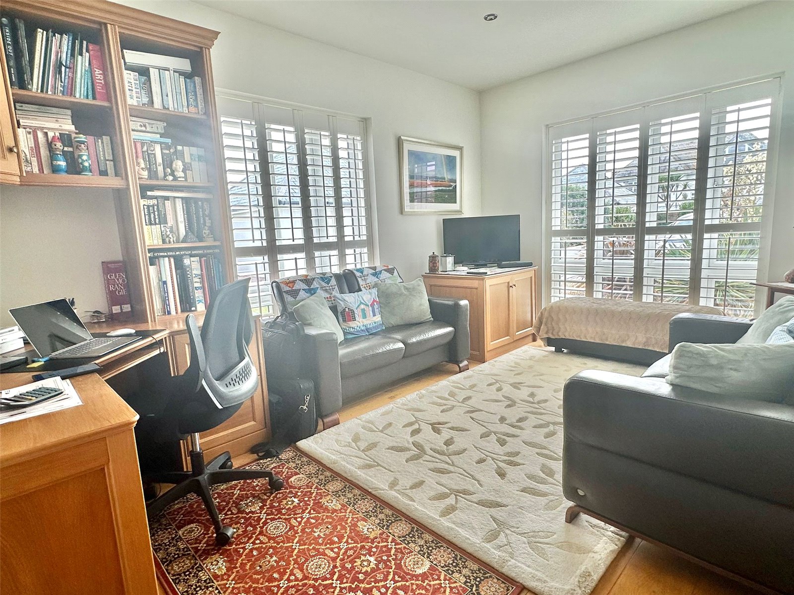 Double aspect full height UPVC double glazed windows with fitted shutter blinds and a view towards Hurst Road seafront and the other aspect across to Sturt Pond, oak engineered flooring, central heating radiator, recessed ceiling spotlighting, range of fitted solid wood office furniture