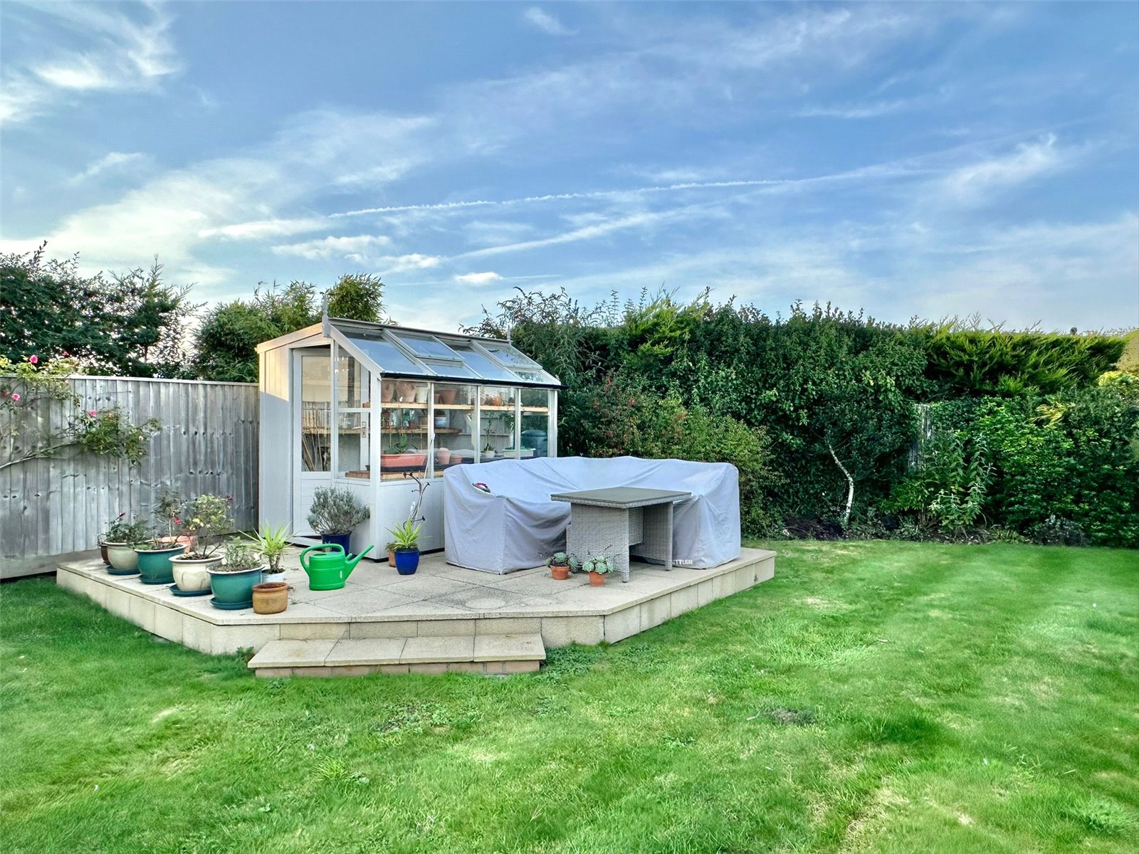 Large open rear garden with a paved Travertine terrace immediately adjacent to the rear of the house and the Conservatory, the remainder is predominantly laid to lawn, with further areas of paving, shrubs and specimen tree borders, fenced boundaries, timber framed Potting Shed, outside cold water tap, and side pedestrian gate.