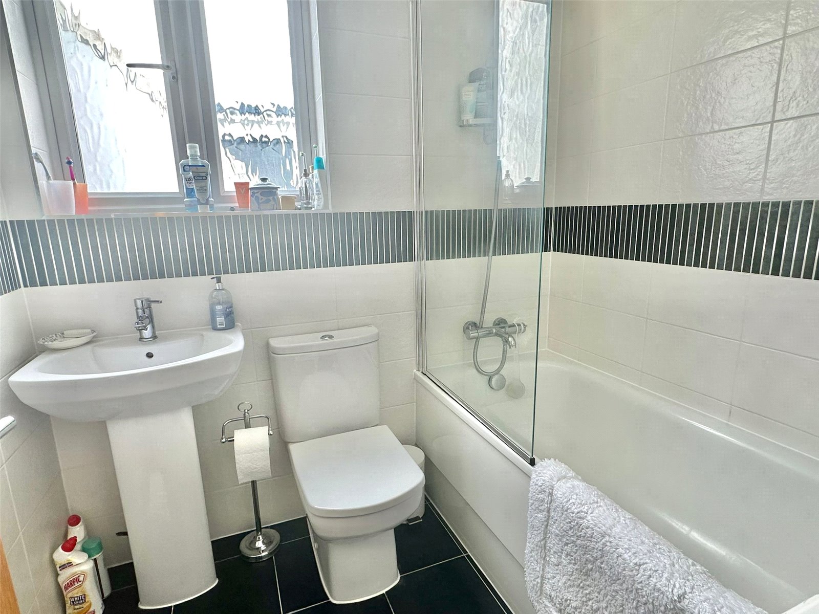 Comprising bath with mixer tap shower attachment and fitted shower screen, wc, wash hand basin, tiled floor and walls, shaver point, heated towel rail, recessed ceiling spotlighting, extractor, obscure UPVC double glazed window
