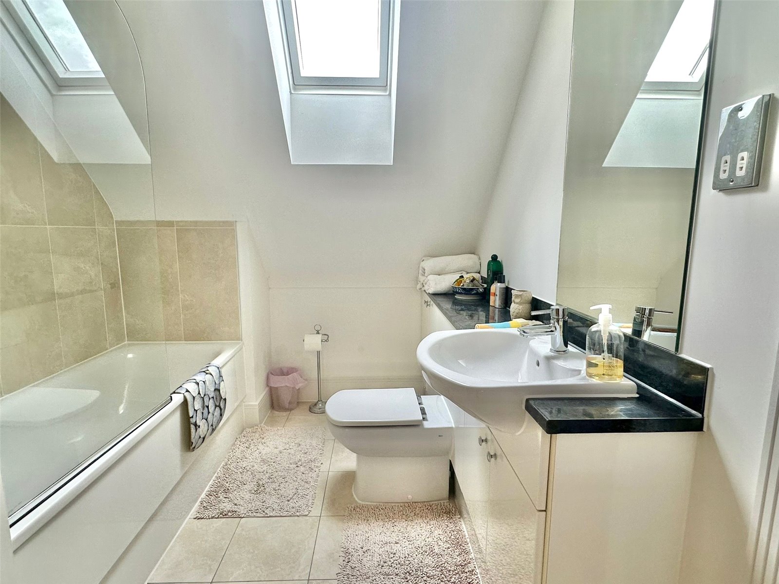 Ensuite to Bedroom Two with a Jack & Jill door to the first floor landing, comprising bath with mixer tap shower attachment and shower screen, concealed cistern wc, vanity wash hand basin, shaver point, recessed ceiling spotlighting, tiled flooring, part tiled wall, heated towel rail, extractor, UPVC double glazed Velux window