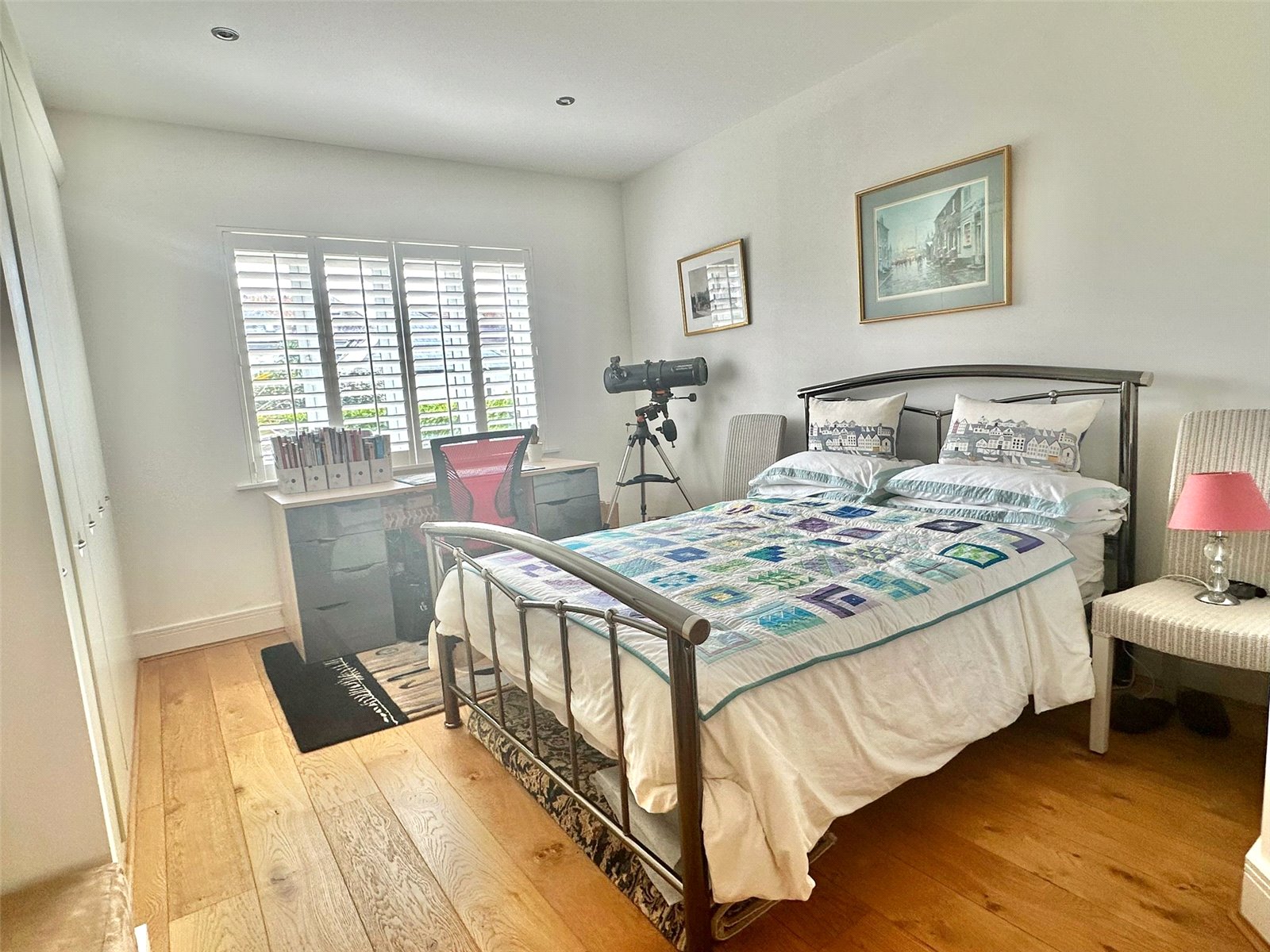 UPVC double glazed window overlooking the front aspect with fitted plantation shutter blinds, oak engineered flooring, central heating radiator, recessed ceiling spotlighting, fitted wardrobes, and door leading to: