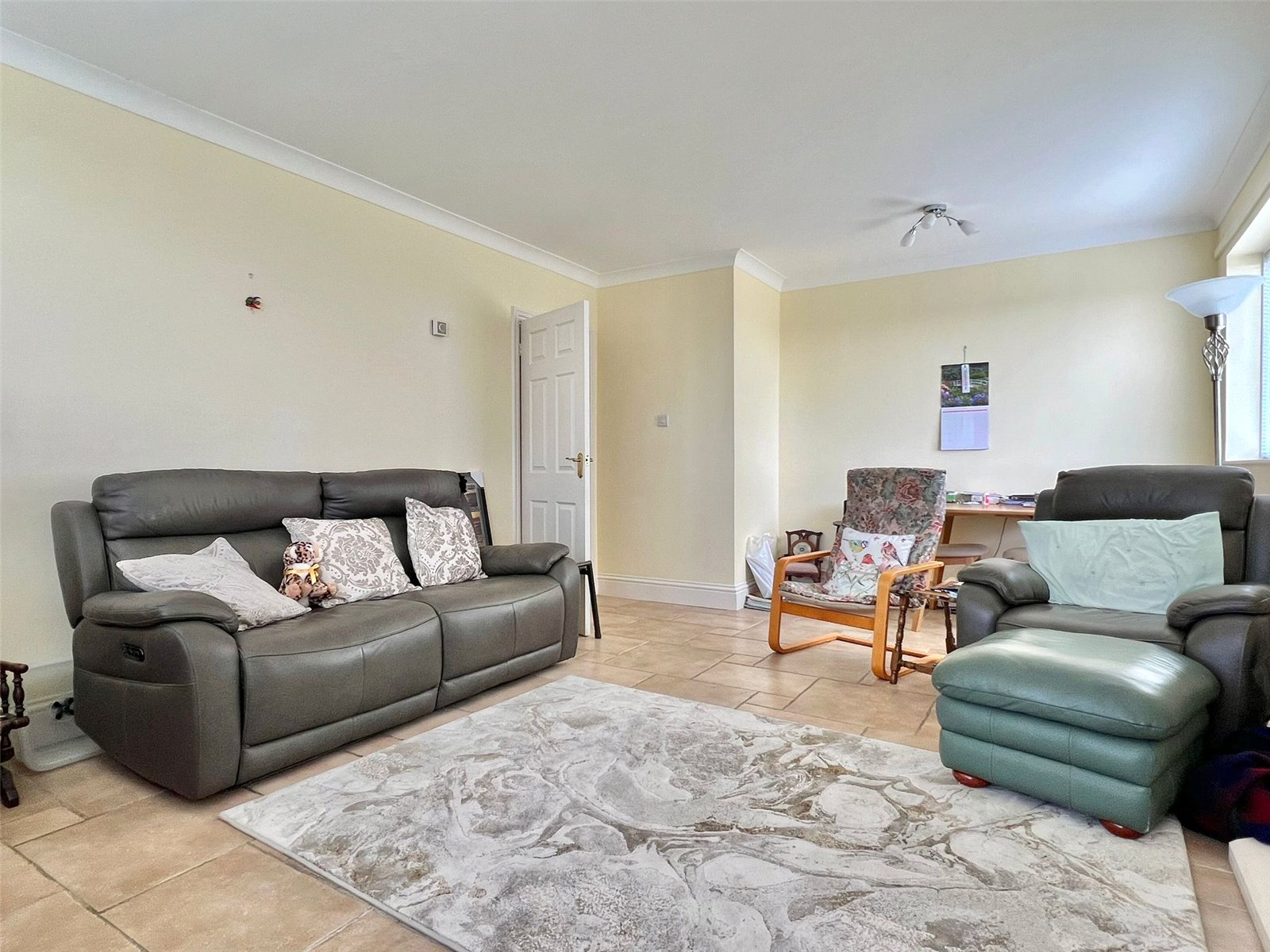 Double aspect UPVC double glazed windows and door overlooking and leading onto the westerly aspect communal grounds, central polished stone effect feature fireplace, ceiling light points, tv point, fitted blinds
