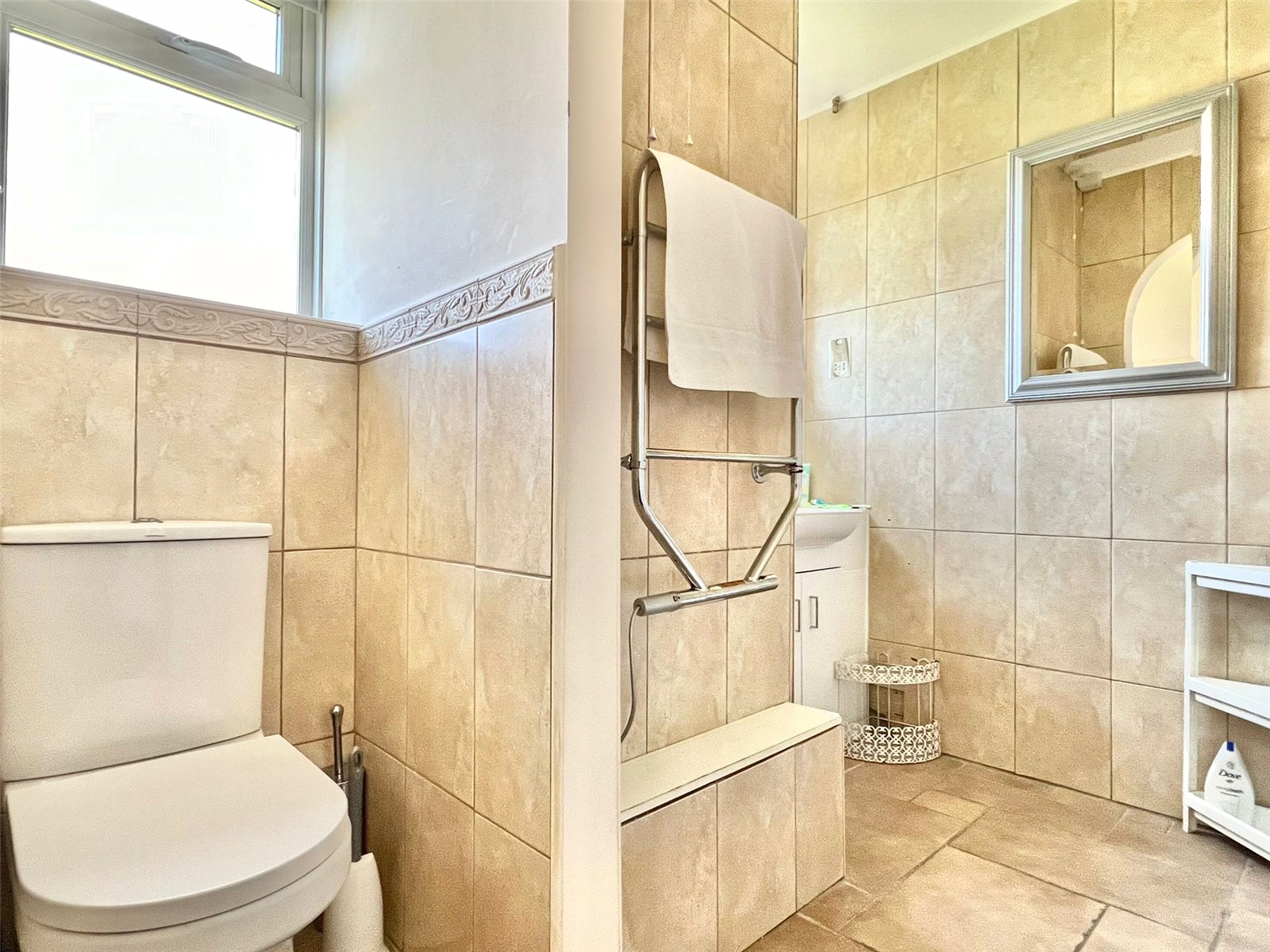 Comprising bath with mixer tap shower attachment, wc, vanity wash hand basin, shaver point, recessed ceiling spotlighting, heated towel rail, tiled walls, wall mounted electric heater, obscure UPVC double glazed window