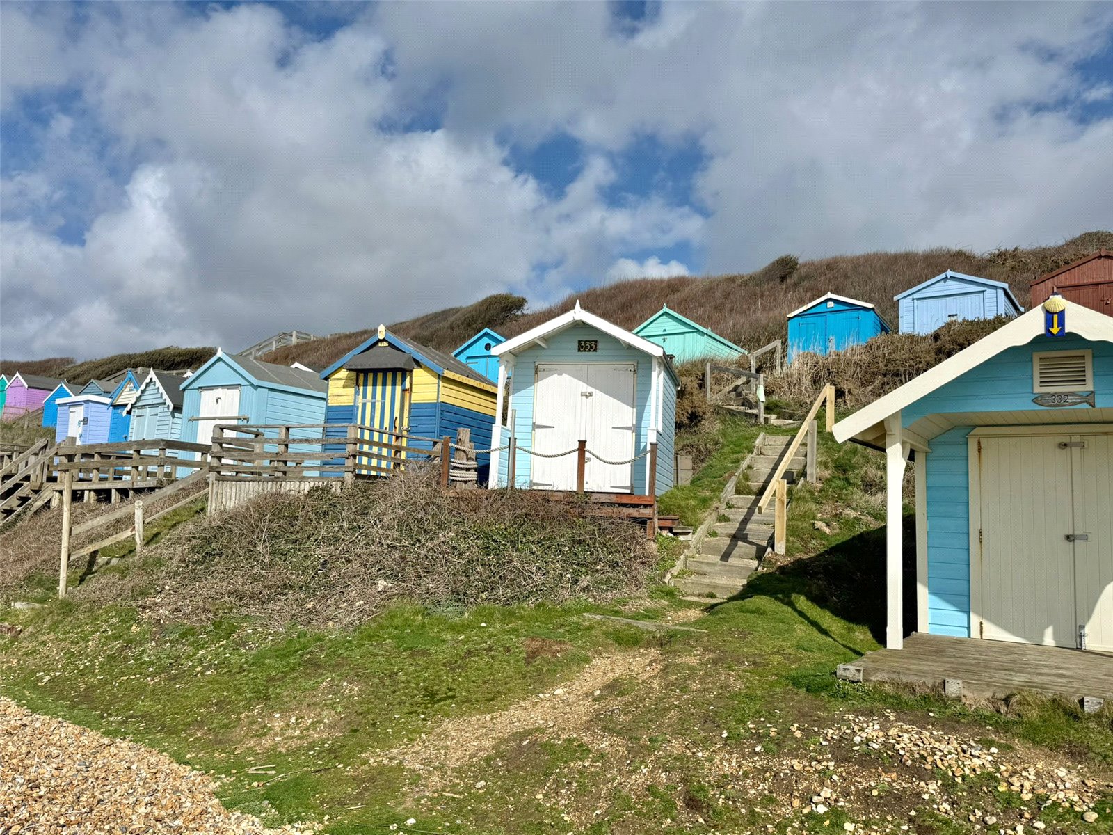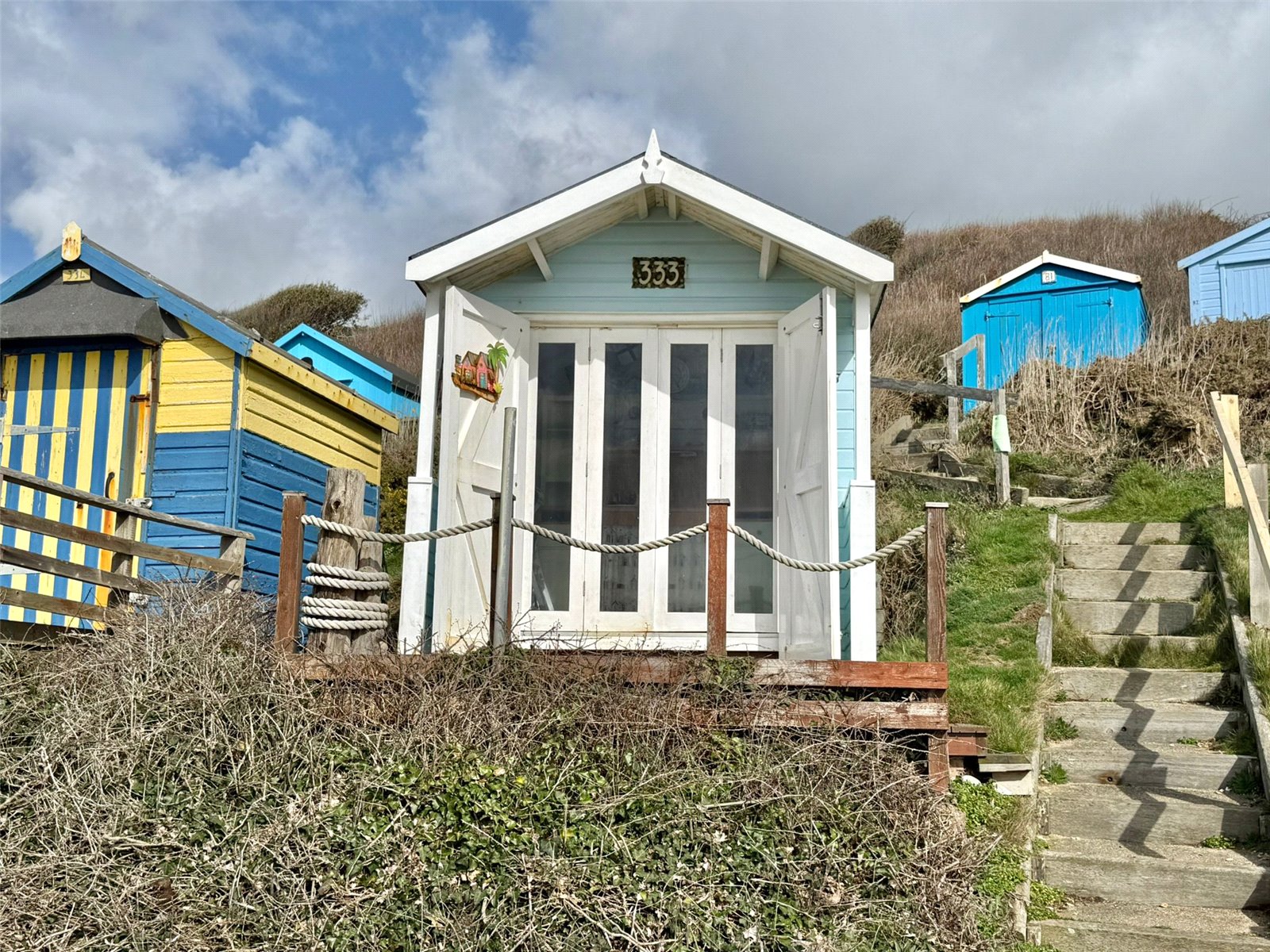 DIRECTIONAL NOTE: From Milford-on-Sea village centre, proceed out of the village in a westerly direction along the High Street, joining Park Lane (B3058) which then becomes Cliff Road. Continue until reaching the second car park on the left hand side (with kiosk and toilets). The access to Hut 333 will be found via the set of steps located closest to the kiosk. At the first level, turn right and continue to along to a further set of steps. Proceed down the steps and No. 333 will be found at the bottom on the right hand side.