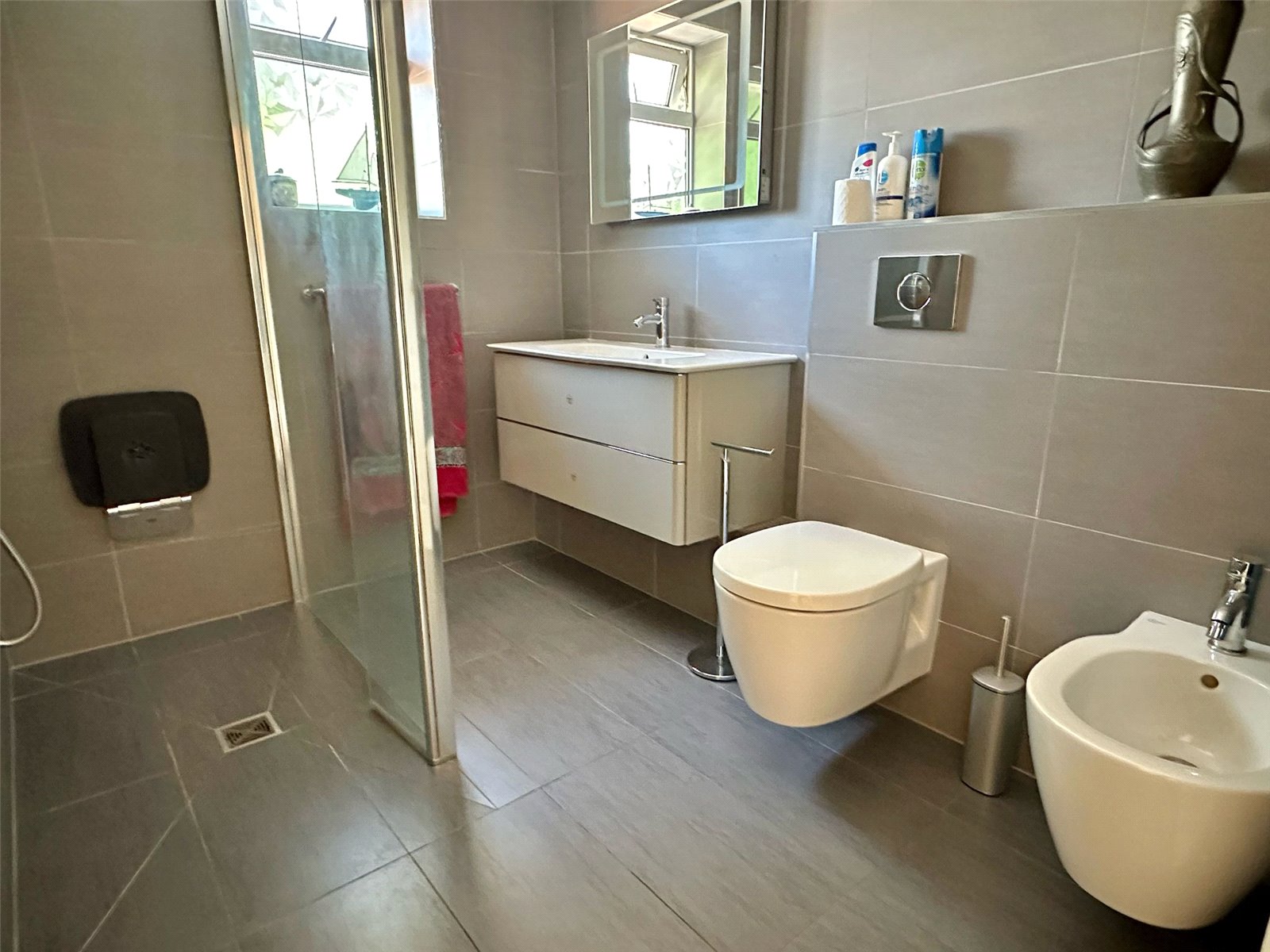 Wet room style shower, bidet, concealed cistern wc with adjacent vanity wash hand basin with mirror light and shaver point over, tiled floor and walls, recess ceiling spotlighting, heated towel rail UPVC double glazed window.
