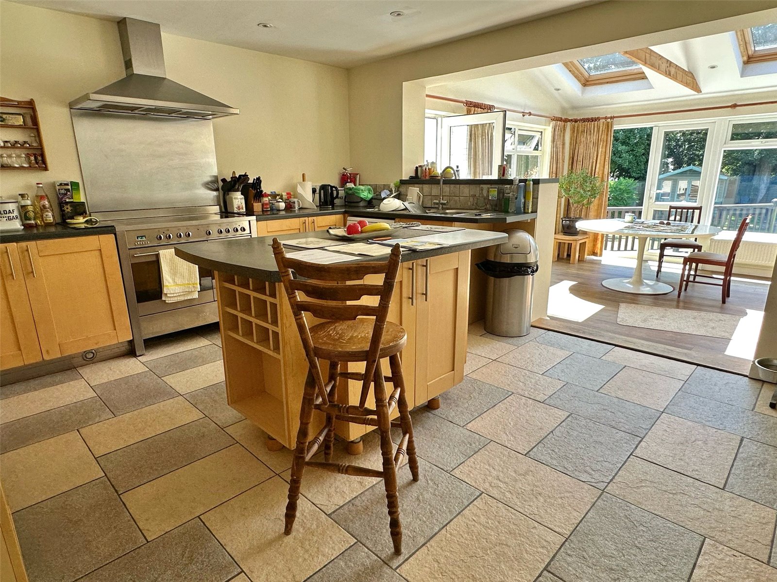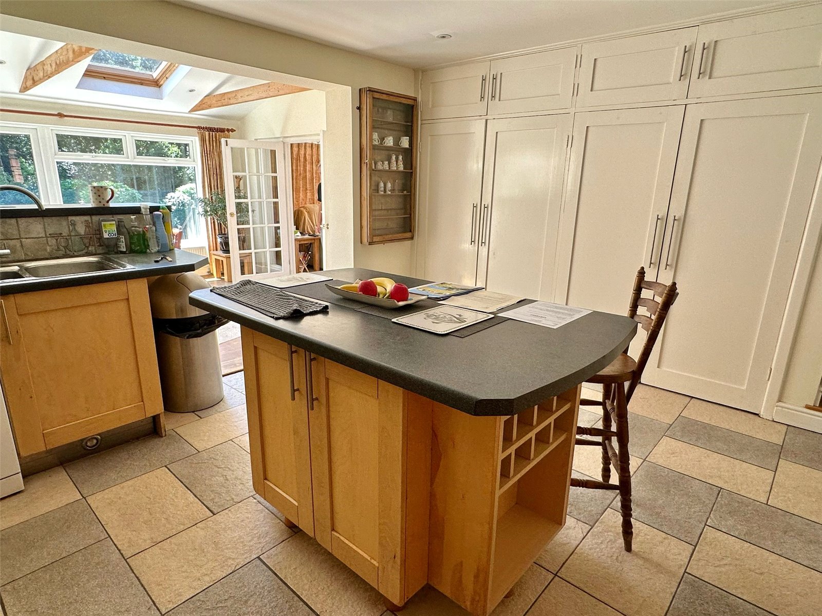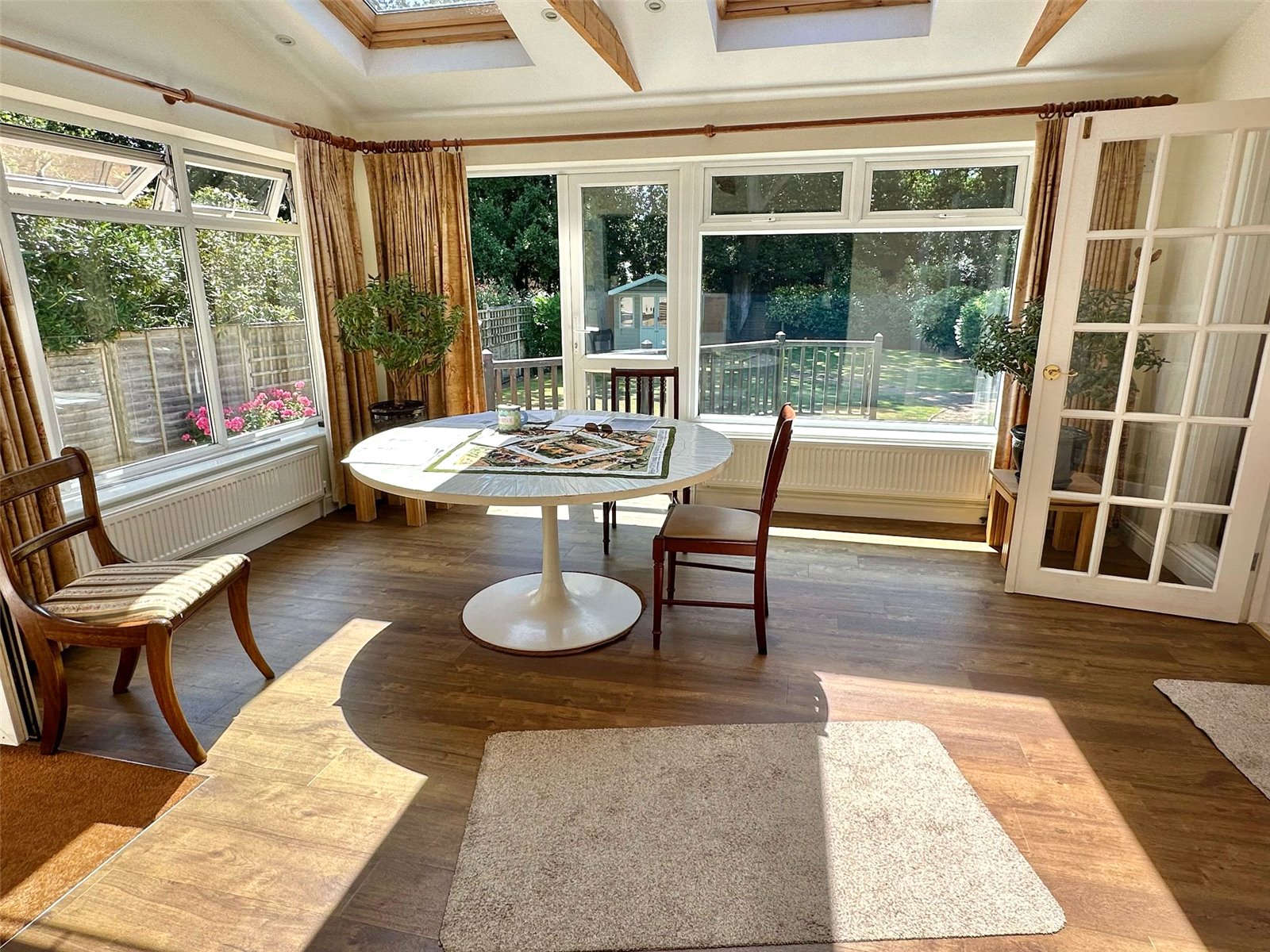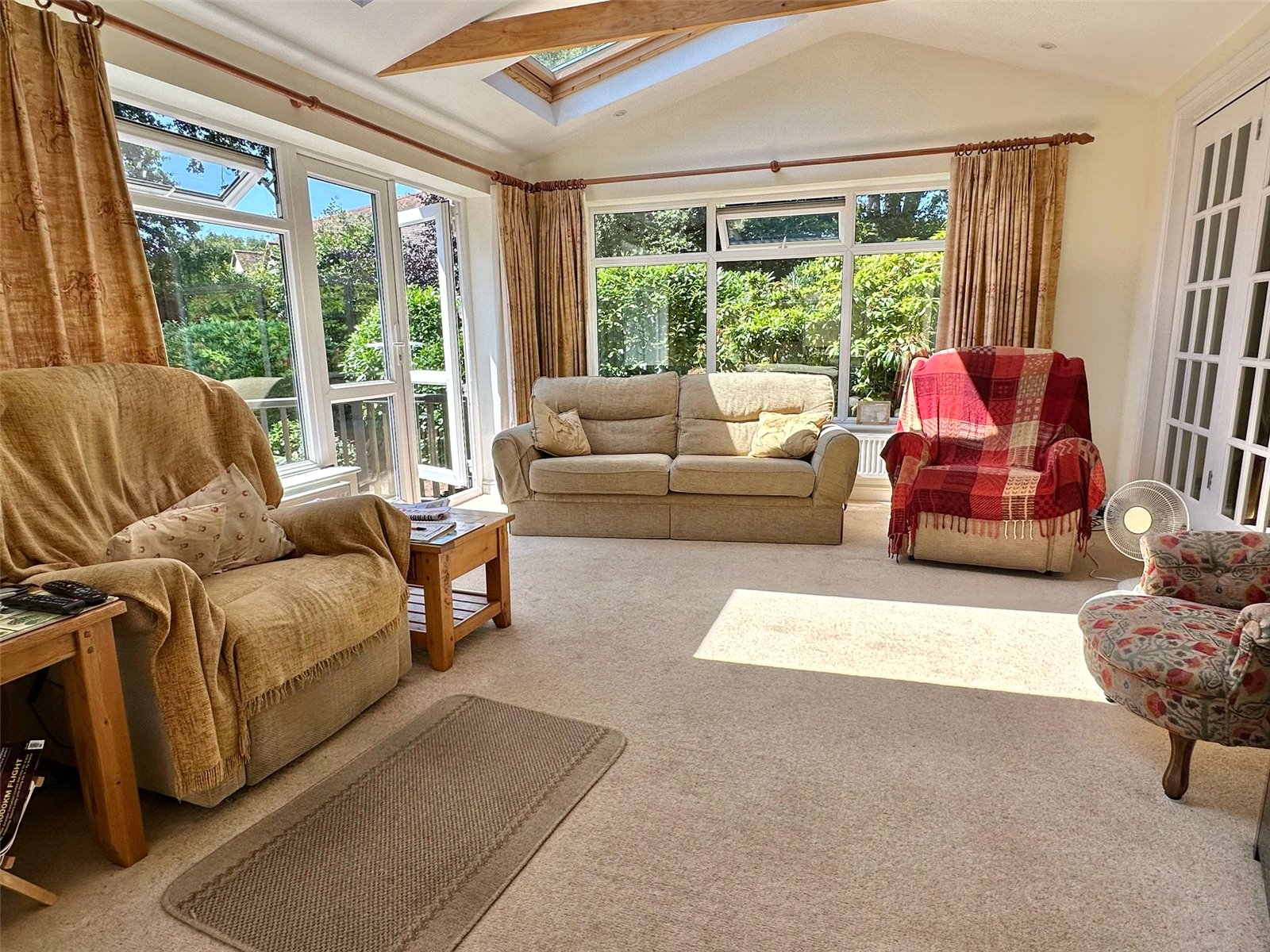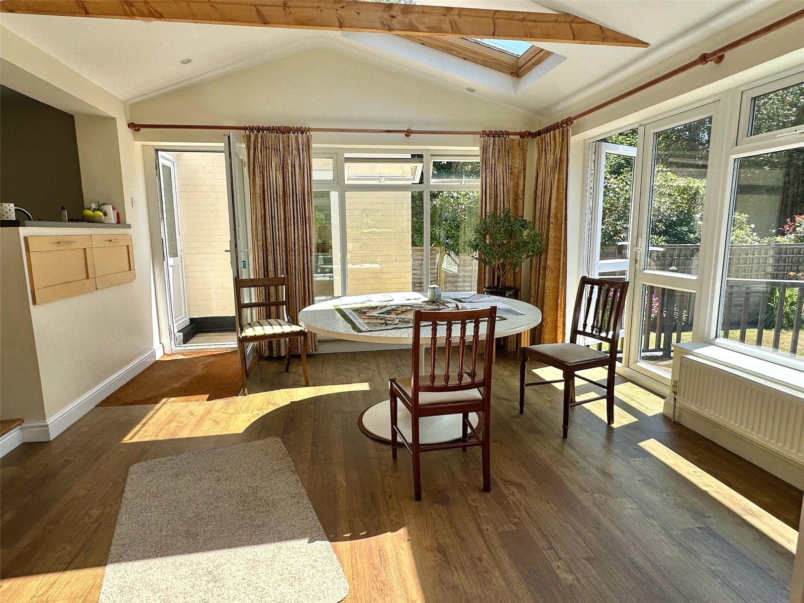 The kitchen comprises one and a half bowl single drainer mixer tap sink unit set into a work surface with base cupboard and drawer units, space for range style cooker with extractor over, space and plumbing for washing machine, space for tall fridge freezer, further larder cupboard, recess ceiling spotlighting. The breakfast area has double aspect UPVC double glazed windows and doors overlooking and leading onto the southerly aspect rear garden, vaulted ceiling, further double-glazed Velux windows, recess ceiling spotlighting, central heating radiators. double opening glazed doors from the breakfast room and fully opening glazed doors from the sitting room lead to: