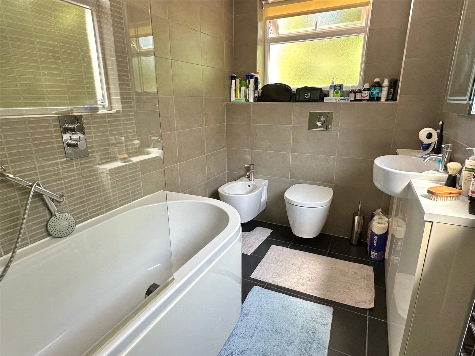 Comprising bath with fitted shower and shower screen, bidet, concealed cistern wc, vanity wash hand basin with mirror light and shaver point over, heated towel rail, tiled floor and walls, recessed ceiling spotlighting, obscured UPVC double glazed windows, trap giving access to the roof space.