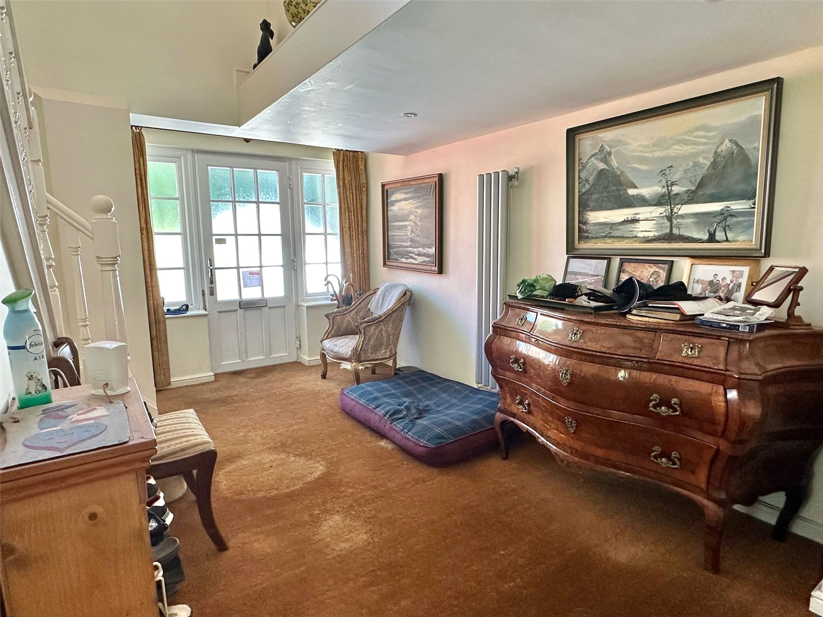 Recess ceiling spotlighting, upright radiator, coats cupboard, understairs cupboard, further storage cupboard