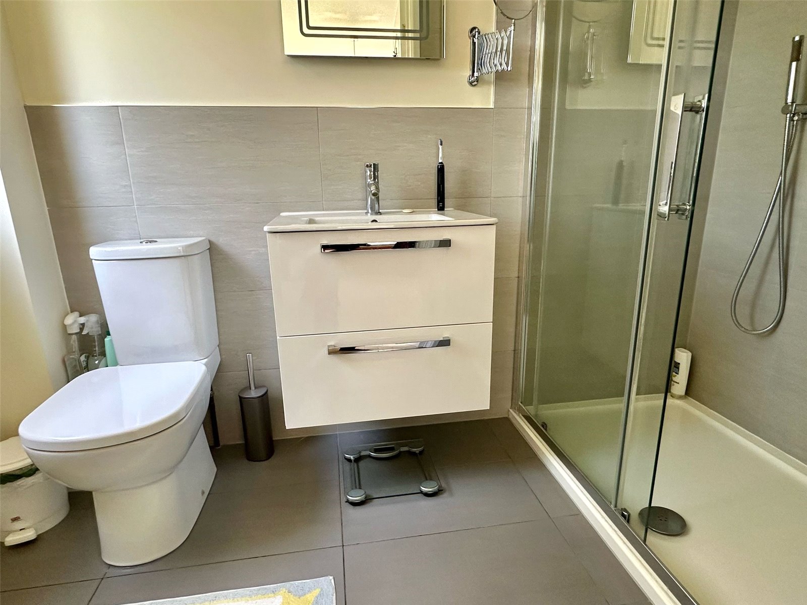 Comprising good sized shower, wc, vanity wash hand basin with mirror light and shaver point over, recess ceiling spotlighting, heated towel rail, obscured UPVC double glazed window
