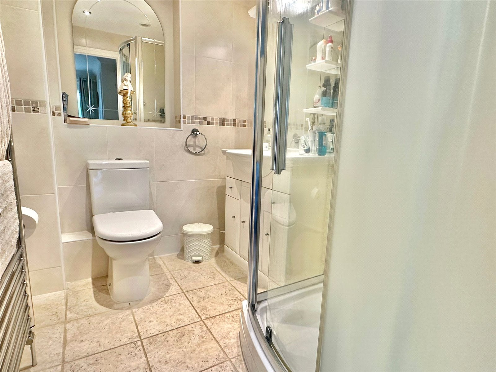 Comprising good sized shower, wc, vanity wash hand basin with mirror light and shaver point over, recess ceiling spotlighting, tiled floor and walls, heated towel rail