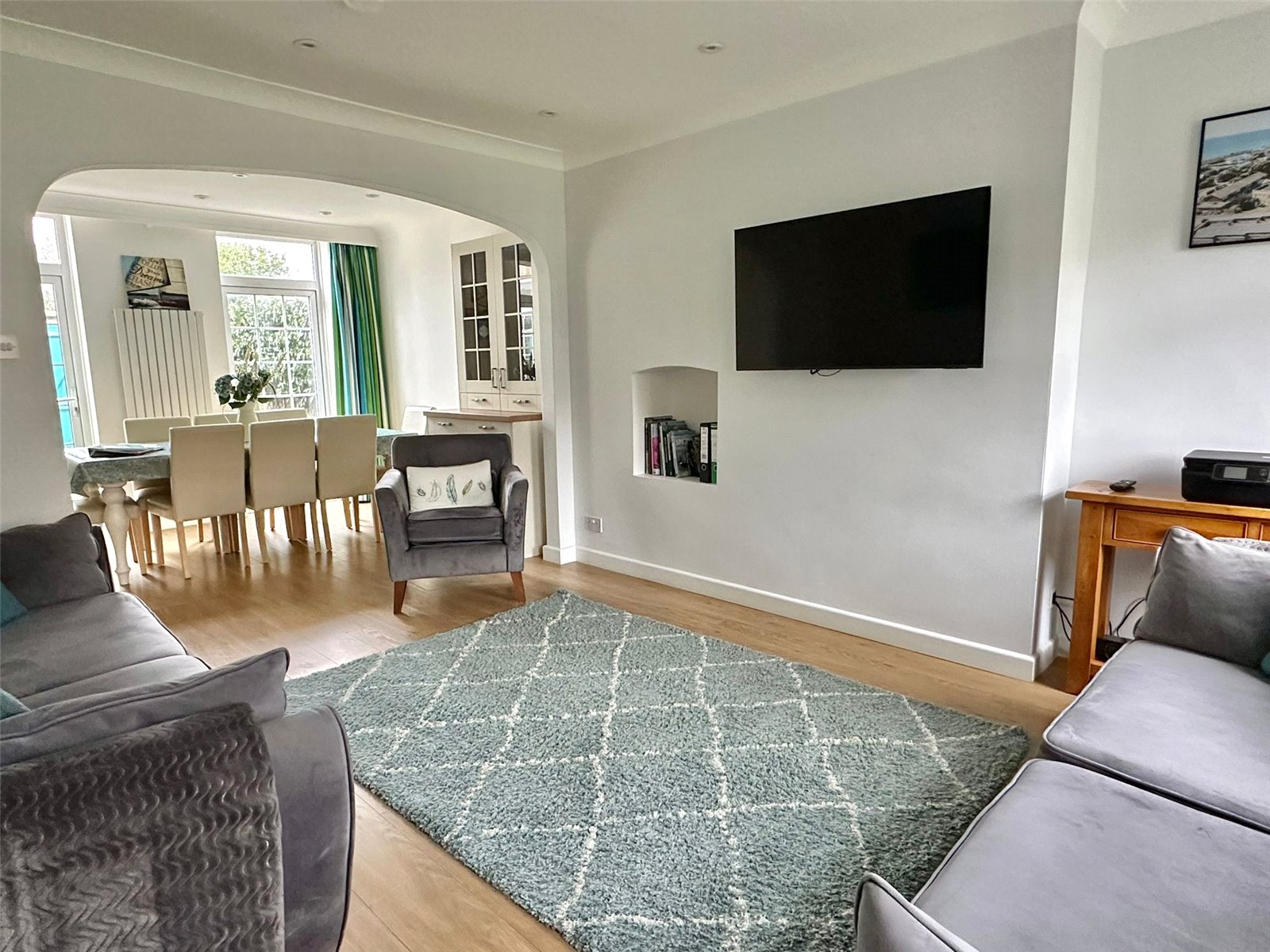UPVC double glazed windows to the front aspect, central heating radiator, oak effect flooring, recessed ceiling spotlighting, wall mounted TV point, and free flowing access to: