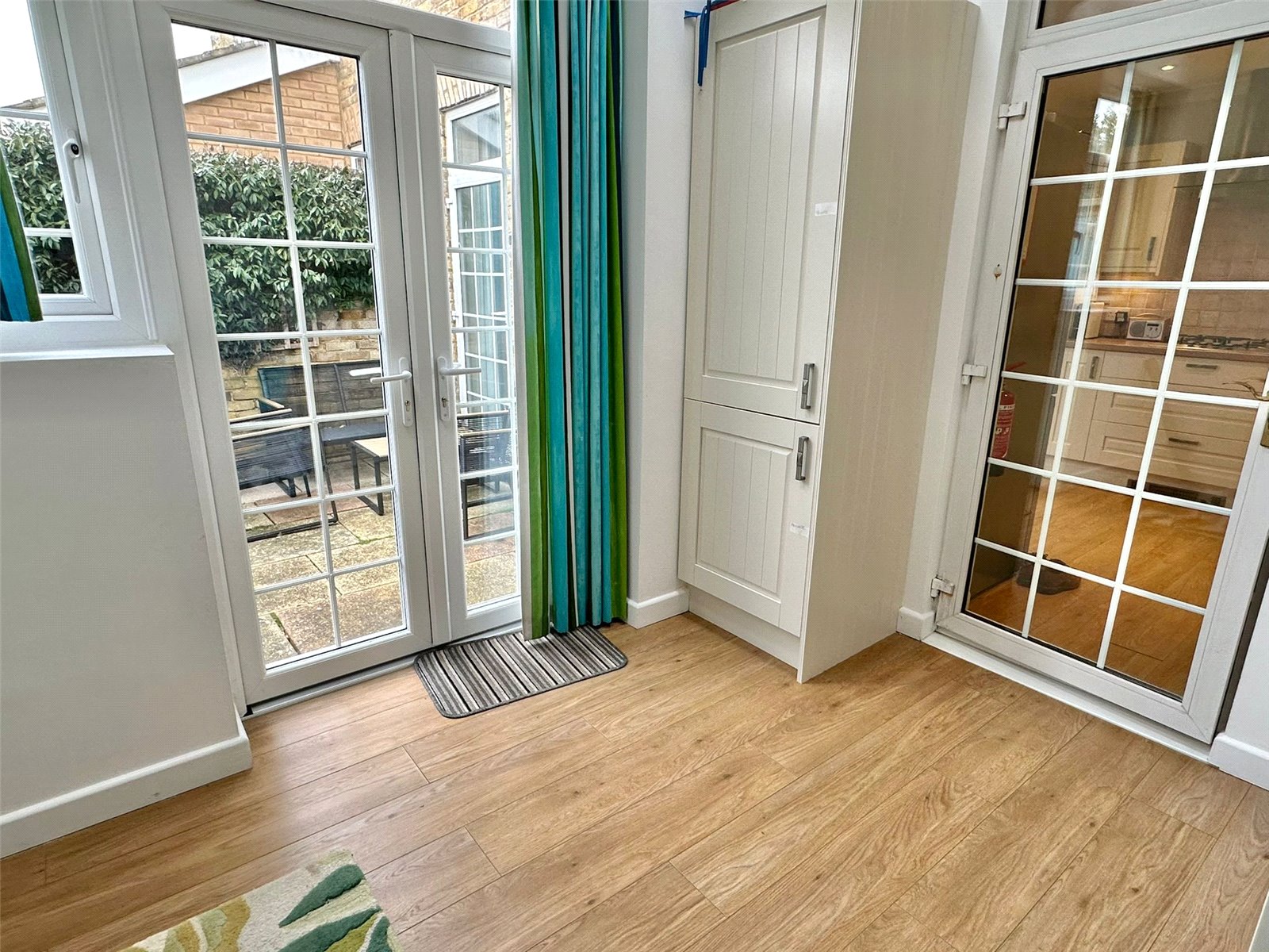 Oak effect flooring, central heating radiator, ceiling light point, under stairs cupboard, and double opening doors leading to: