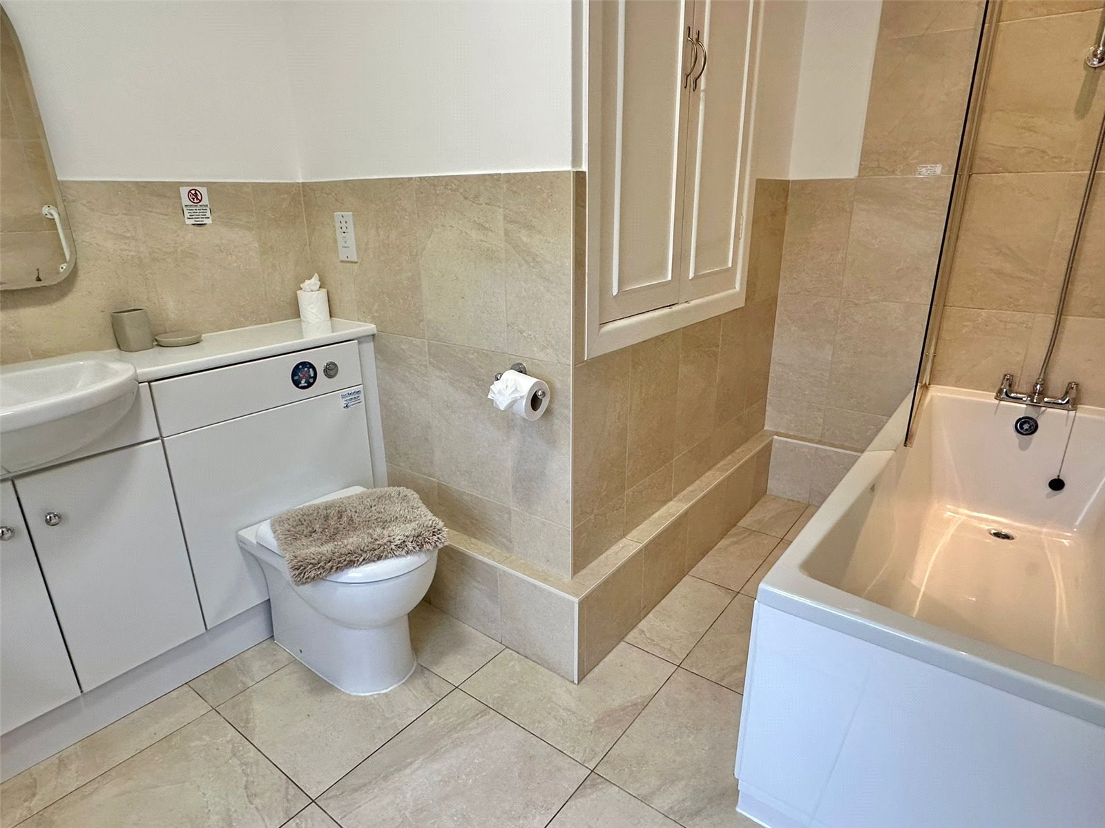 Comprising bath with mixer tap shower attachment and shower screen, vanity wash hand basin, concealed cistern wc, mirror light, ceiling light point, tiled flooring and part tiled walls, shaver point, UPVC double glazed window, central heating radiator, linen cupboard
